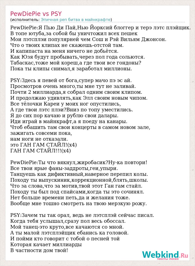 PewDiePie:Я Пью Ди Пай,Нью Йорксий блоггер и терэ лэтс плэйщик. В топе ютуба,за собой бы уничтожил всех пешек Мои лэтсплэи популярней чем Сош и Рэй Вильям Джонсон. Что о твоих клипах не скажешь-отстой там. И капипаста на меня ничего не добьётся. Как Юзя будут пробывать,через пол года сольются. Табаскас,тоже мой кореш,а где твои все гондоны? Пока ты клипы снимал,я заработал миллионы. PSY:Здесь я певей от бога,супер мачо пэ эс ай. Просмотров очень много,ты мне тут не заливай. Почти 2 миллиарда,я собрал одним своим клипом. И продолжаю удивлять,как Элл своим новым чипом. Все тёлочки Кареи у моих ног опустились, А где твои лэтс плэи?Вниз по топу уместились. Я до сих пор качаю и рублю свои далары. Иди играй в майнкрафт,а я поеду на канары. Чтоб ебашить там свои концерты в самом новом зале, зажигать совсеми пока, нам ноги не отказали. это ГАН ГАМ СТАЙЛ!(x4) ГАН ГАМ СТАЙЛ!!!(x4) PewDiePie:Ты что вякнул,жиробасик?Ну-ка повтори! Все твои ярые фаны-заддроты,геи,упыри. Танцуешь как дификтивный,наверное перепил колы. Походу ты выпускиник,коррекционной,блять,школы. Что за слова,что за мотив,твой этот Ган гам стайл. Походу ты был под спайсами,когда ты это сочинял. Нет больше времени петь,да и желания тоже. Вообще мне тошно смотреть на твою мерзкую рожу. PSY:Зачем ты так орал, ведь не лэтсплэй сейчас писал. Когда тебя услышал,сразу пол весь обоссал. Мой танец-это круто,все качаются со мной. А ты малой лэтсплэйщик ебанись ка головой. И пойми кто говорит с тобой о песней той Которая качает миллиарды В частности дом твой!