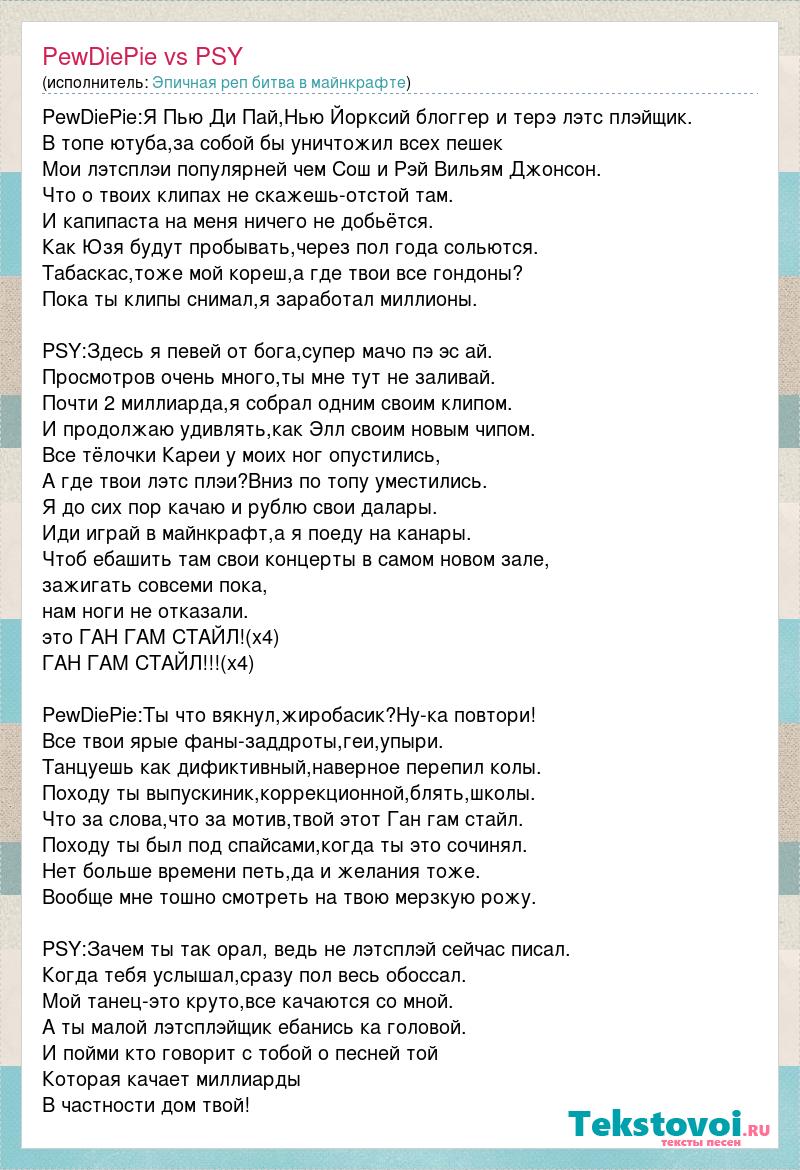 PewDiePie:Я Пью Ди Пай,Нью Йорксий блоггер и терэ лэтс плэйщик. В топе ютуба,за собой бы уничтожил всех пешек Мои лэтсплэи популярней чем Сош и Рэй Вильям Джонсон. Что о твоих клипах не скажешь-отстой там. И капипаста на меня ничего не добьётся. Как Юзя будут пробывать,через пол года сольются. Табаскас,тоже мой кореш,а где твои все гондоны? Пока ты клипы снимал,я заработал миллионы. PSY:Здесь я певей от бога,супер мачо пэ эс ай. Просмотров очень много,ты мне тут не заливай. Почти 2 миллиарда,я собрал одним своим клипом. И продолжаю удивлять,как Элл своим новым чипом. Все тёлочки Кареи у моих ног опустились, А где твои лэтс плэи?Вниз по топу уместились. Я до сих пор качаю и рублю свои далары. Иди играй в майнкрафт,а я поеду на канары. Чтоб ебашить там свои концерты в самом новом зале, зажигать совсеми пока, нам ноги не отказали. это ГАН ГАМ СТАЙЛ!(x4) ГАН ГАМ СТАЙЛ!!!(x4) PewDiePie:Ты что вякнул,жиробасик?Ну-ка повтори! Все твои ярые фаны-заддроты,геи,упыри. Танцуешь как дификтивный,наверное перепил колы. Походу ты выпускиник,коррекционной,блять,школы. Что за слова,что за мотив,твой этот Ган гам стайл. Походу ты был под спайсами,когда ты это сочинял. Нет больше времени петь,да и желания тоже. Вообще мне тошно смотреть на твою мерзкую рожу. PSY:Зачем ты так орал, ведь не лэтсплэй сейчас писал. Когда тебя услышал,сразу пол весь обоссал. Мой танец-это круто,все качаются со мной. А ты малой лэтсплэйщик ебанись ка головой. И пойми кто говорит с тобой о песней той Которая качает миллиарды В частности дом твой!