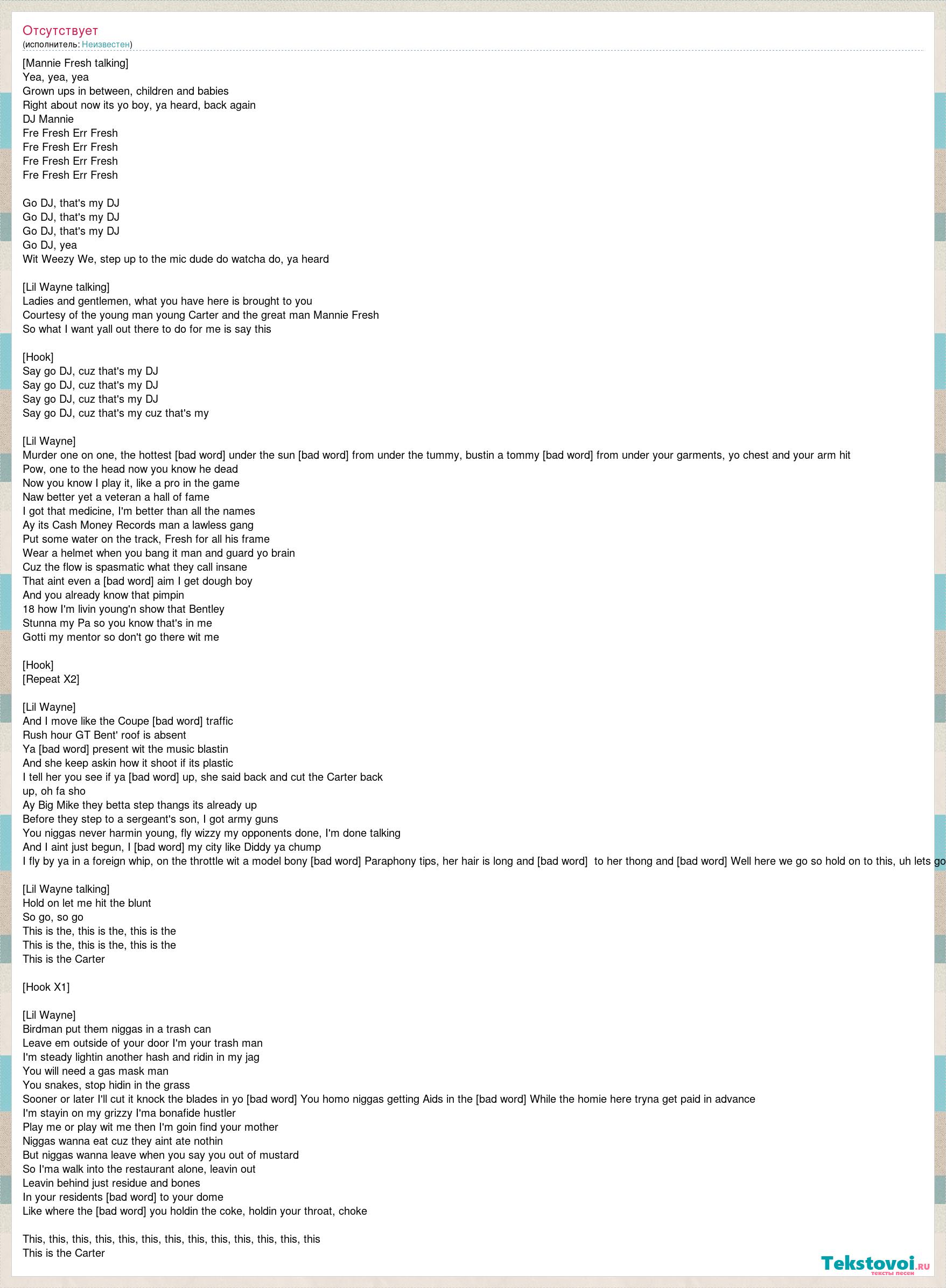 [Mannie Fresh talking] Yea, yea, yea Grown ups in between, children and babies Right about now its yo boy, ya heard, back again DJ Mannie Fre Fresh Err Fresh Fre Fresh Err Fresh Fre Fresh Err Fresh Fre Fresh Err Fresh Go DJ, that's my DJ Go DJ, that's my DJ Go DJ, that's my DJ Go DJ, yea Wit Weezy We, step up to the mic dude do watcha do, ya heard [Lil Wayne talking] Ladies and gentlemen, what you have here is brought to you Courtesy of the young man young Carter and the great man Mannie Fresh So what I want yall out there to do for me is say this [Hook] Say go DJ, cuz that's my DJ Say go DJ, cuz that's my DJ Say go DJ, cuz that's my DJ Say go DJ, cuz that's my cuz that's my [Lil Wayne] Murder one on one, the hottest [bad word] under the sun I come from under the tummy, bustin a tommy Or come from under your garments, yo chest and your arm hit Pow, one to the head now you know he dead Now you know I play it, like a pro in the game Naw better yet a veteran a hall of fame I got that medicine, I'm better than all the names Ay its Cash Money Records man a lawless gang Put some water on the track, Fresh for all his frame Wear a helmet when you bang it man and guard yo brain Cuz the flow is spasmatic what they call insane That aint even a [bad word] aim I get dough boy And you already know that pimpin 18 how I'm livin young'n show that Bentley Stunna my Pa so you know that's in me Gotti my mentor so don't go there wit me [Hook] [Repeat X2] [Lil Wayne] And I move like the Coupe thru traffic Rush hour GT Bent' roof is absent Ya [bad word] present wit the music blastin And she keep askin how it shoot if its plastic I tell her you see if ya boy run up, she said back and cut the Carter back up, oh fa sho Ay Big Mike they betta step thangs its already up Before they step to a sergeant's son, I got army guns You niggas never harmin young, fly wizzy my opponents done, I'm done talking And I aint just begun, I been runnin my city like Diddy ya chump I fly by ya in a foreign whip, on the throttle wit a model bony [bad word] Paraphony tips, her hair is long and [bad word] to her thong and [bad word] Well here we go so hold on to this, uh lets go [Lil Wayne talking] Hold on let me hit the blunt So go, so go This is the, this is the, this is the This is the, this is the, this is the This is the Carter [Hook X1] [Lil Wayne] Birdman put them niggas in a trash can Leave em outside of your door I'm your trash man I'm steady lightin another hash and ridin in my jag You will need a gas mask man You snakes, stop hidin in the grass Sooner or later I'll cut it knock the blades in yo [bad word] You homo niggas getting Aids in the [bad word] While the homie here tryna get paid in advance I'm stayin on my grizzy I'ma bonafide hustler Play me or play wit me then I'm goin find your mother Niggas wanna eat cuz they aint ate nothin But niggas wanna leave when you say you out of mustard So I'ma walk into the restaurant alone, leavin out Leavin behind just residue and bones In your residents with Rugers to your dome Like where the [bad word] you holdin the coke, holdin your throat, choke This, this, this, this, this, this, this, this, this, this, this, this, this This is the Carter