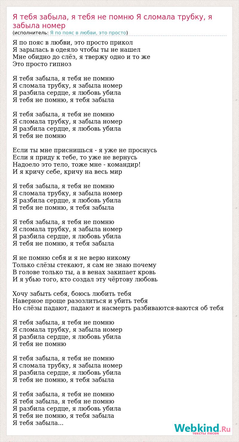 Я по пояс в любви, это просто прикол Я зарылась в одеяло чтобы ты не нашел Мне обидно до слёз, я твержу одно и то же Это просто гипноз Я тебя забыла, я тебя не помню Я сломала трубку, я забыла номер Я разбила сердце, я любовь убила Я тебя не помню, я тебя забыла Я тебя забыла, я тебя не помню Я сломала трубку, я забыла номер Я разбила сердце, я любовь убила Я тебя не помню Если ты мне приснишься - я уже не проснусь Если я приду к тебе, то уже не вернусь Надоело это тело, тоже мне - командир! И я кричу себе, кричу на весь мир Я тебя забыла, я тебя не помню Я сломала трубку, я забыла номер Я разбила сердце, я любовь убила Я тебя не помню, я тебя забыла Я тебя забыла, я тебя не помню Я сломала трубку, я забыла номер Я разбила сердце, я любовь убила Я тебя не помню, я тебя забыла Я не помню себя и я не верю никому Только слёзы стекают, я сам не знаю почему В голове только ты, а в венах закипает кровь И я убью того, кто создал эту чёртову любовь Хочу забыть себя, боюсь любить тебя Наверное проще разозлиться и убить тебя Но слёзы падают, падают и насмерть разбиваются-ваются об тебя Я тебя забыла, я тебя не помню Я сломала трубку, я забыла номер Я разбила сердце, я любовь убила Я тебя не помню Я тебя забыла, я тебя не помню Я сломала трубку, я забыла номер Я разбила сердце, я любовь убила Я тебя не помню, я тебя забыла Я тебя забыла, я тебя не помню Я тебя забыла, я тебя не помню Я разбила сердце, я любовь убила Я тебя не помню, я тебя забыла Я тебя забыла...
