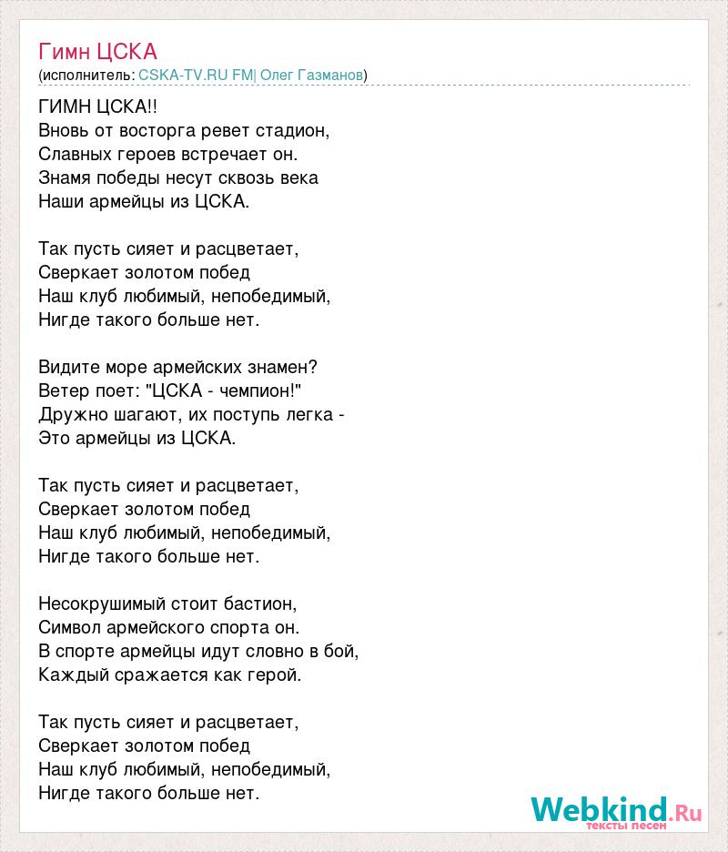 ГИМН ЦСКА!! Вновь от восторга ревет стадион, Славных героев встречает он. Знамя победы несут сквозь века Наши армейцы из ЦСКА. Так пусть сияет и расцветает, Сверкает золотом побед Наш клуб любимый, непобедимый, Нигде такого больше нет. Видите море армейских знамен? Ветер поет: "ЦСКА - чемпион!" Дружно шагают, их поступь легка - Это армейцы из ЦСКА. Так пусть сияет и расцветает, Сверкает золотом побед Наш клуб любимый, непобедимый, Нигде такого больше нет. Несокрушимый стоит бастион, Символ армейского спорта он. В спорте армейцы идут словно в бой, Каждый сражается как герой. Так пусть сияет и расцветает, Сверкает золотом побед Наш клуб любимый, непобедимый, Нигде такого больше нет.