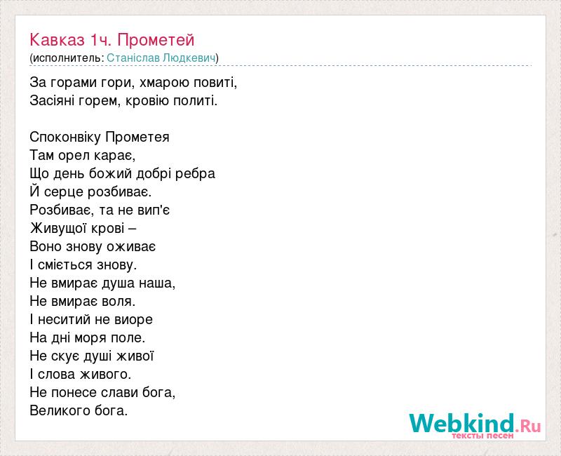 За горами гори, хмарою повиті, Засіяні горем, кровію политі. Споконвіку Прометея Там орел карає, Що день божий добрі ребра Й серце розбиває. Розбиває, та не вип'є Живущої крові – Воно знову оживає І сміється знову. Не вмирає душа наша, Не вмирає воля. І неситий не виоре На дні моря поле. Не скує душі живої І слова живого. Не понесе слави бога, Великого бога.
