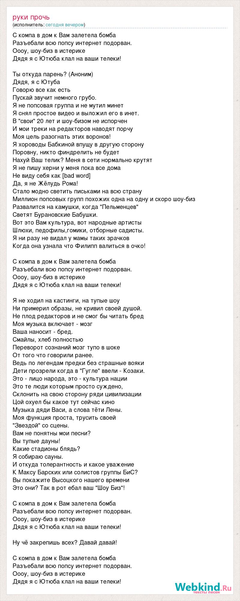 С компа в дом к Вам залетела бомба Разъебали всю попсу интернет подорван. Оооу, шоу-биз в истерике Дядя я с Ютюба клал на ваши телеки! Ты откуда парень? (Аноним) Дядя, я с Ютуба Говорю все как есть Пускай звучит немного грубо. Я не попсовая группа и не мутил минет Я снял простое видео и выложил его в инет. В "свои" 20 лет и шоу-бизом не испорчен И мои треки на редакторов наводят порчу Моя цель разогнать этих воронов! Я хороводы Бабкиной впущу в другую сторону Поровну, никто финдрелить не будет Нахуй Ваш телик? Меня в сети нормально крутят Я не пишу херни у меня пока все дома Не виду себя как [bad word] Да, я не Жёлудь Рома! Стало модно светить письками на всю страну Миллион попсовых групп похожих одна на одну и скоро шоу-биз Развалится на камушки, когда "Пельменцев" Светят Бурановские Бабушки. Вот это Вам культура, вот народные артисты Шлюхи, педофилы,гомики, отборные садисты. Я ни разу не видал у мамы таких зрачков Когда она узнала что Филипп валиться в очко! С компа в дом к Вам залетела бомба Разъебали всю попсу интернет подорван. Оооу, шоу-биз в истерике Дядя я с Ютюба клал на ваши телеки! Я не ходил на кастинги, на тупые шоу Ни примерил образы, не кривил своей душой. Не плод редакторов и не смог бы читать бред Моя музыка включает - мозг Ваша наносит - бред. Смайлы, хлеб полностью Переворот сознаний мозг тупо в шоке От того что говорили ранее. Ведь по легендам предки без страшные вояки Дети прозрели когда в "Гугле" ввели - Козаки. Это - лицо народа, это - культура нации Это те люди которым просто суждено, Склонить на свою сторону ряди цивилизации Цой охуел бы какое тут сейчас кино Музыка дяди Васи, а слова тёти Лены. Моя функция проста, трусить своей "Звездой" со сцены. Вам не понятны мои песни? Вы тупые дауны! Какие стадионы блядь? Я собираю сауны. И откуда толерантность и какое уважение К Максу Барских или солистов группы БиС? Вы покажите Высоцкого нашего времени Это они? Так в рот ебал ваш "Шоу Биз"! С компа в дом к Вам залетела бомба Разъебали всю попсу интернет подорван. Оооу, шоу-биз в истерике Дядя я с Ютюба клал на ваши телеки! Ну чё закрепишь всех? Давай давай! С компа в дом к Вам залетела бомба Разъебали всю попсу интернет подорван. Оооу, шоу-биз в истерике Дядя я с Ютюба клал на ваши телеки!