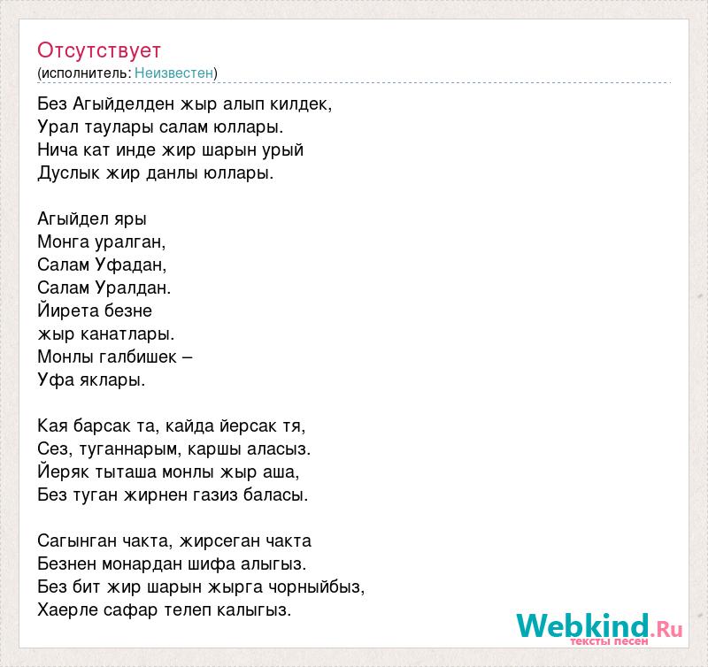Без Агыйделден жыр алып килдек, Урал таулары салам юллары. Нича кат инде жир шарын урый Дуслык жир данлы юллары. Агыйдел яры Монга уралган, Салам Уфадан, Салам Уралдан. Йирета безне жыр канатлары. Монлы галбишек – Уфа яклары. Кая барсак та, кайда йерсак тя, Сез, туганнарым, каршы аласыз. Йеряк тыташа монлы жыр аша, Без туган жирнен газиз баласы. Сагынган чакта, жирсеган чакта Безнен монардан шифа алыгыз. Без бит жир шарын жырга чорныйбыз, Хаерле сафар телеп калыгыз.