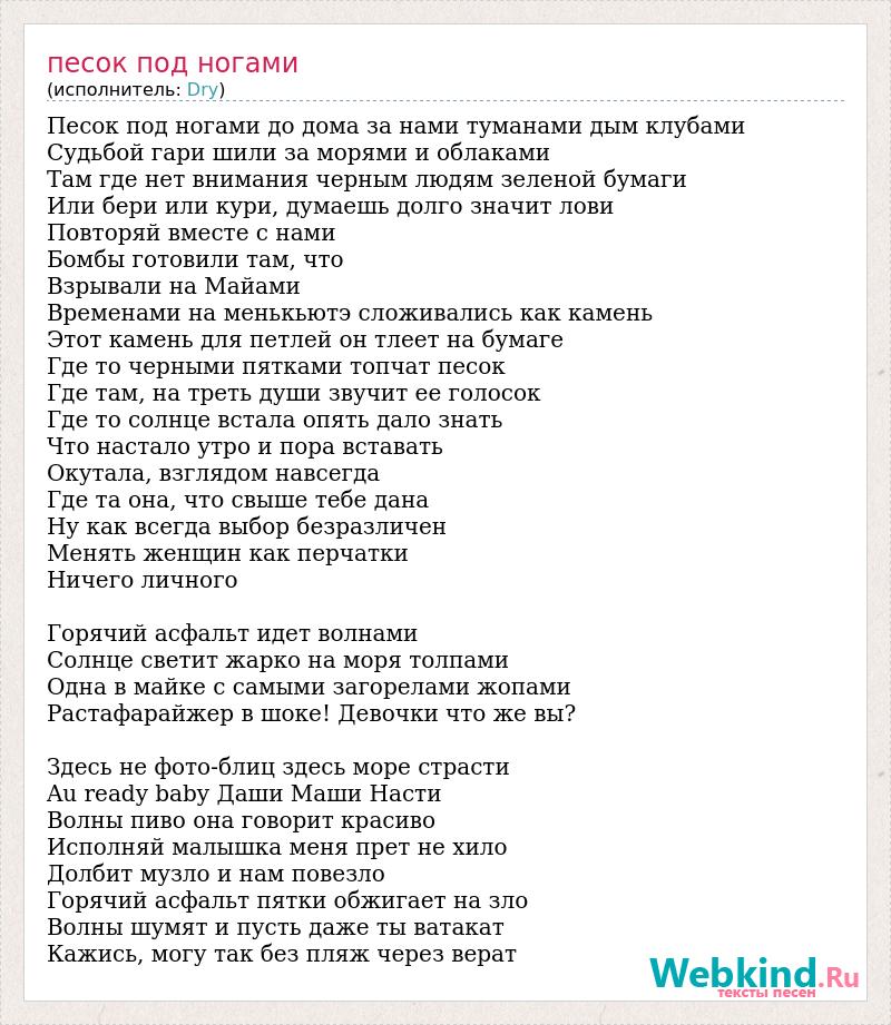 Песок под ногами до дома за нами туманами дым клубами Судьбой гари шили за морями и облаками Там где нет внимания черным людям зеленой бумаги Или бери или кури, думаешь долго значит лови Повторяй вместе с нами Бомбы готовили там, что Взрывали на Майами Временами на менькьютэ сложивались как камень Этот камень для петлей он тлеет на бумаге Где то черными пятками топчат песок Где там, на треть души звучит ее голосок Где то солнце встала опять дало знать Что настало утро и пора вставать Окутала, взглядом навсегда Где та она, что свыше тебе дана Ну как всегда выбор безразличен Менять женщин как перчатки Ничего личного Горячий асфальт идет волнами Солнце светит жарко на моря толпами Одна в майке с самыми загорелами жопами Растафарайжер в шоке! Девочки что же вы? Здесь не фото-блиц здесь море страсти Au ready baby Даши Маши Насти Волны пиво она говорит красиво Исполняй малышка меня прет не хило Долбит музло и нам повезло Горячий асфальт пятки обжигает на зло Волны шумят и пусть даже ты ватакат Кажись, могу так без пляж через верат