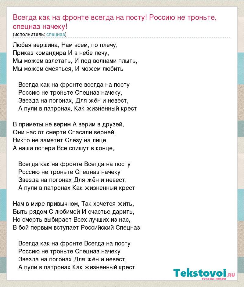 Любая вершина, Нам всем, по плечу, Приказ командира И в небе лечу, Мы можем взлетать, И под волнами плыть, Мы можем смеяться, И можем любить Всегда как на фронте всегда на посту Россию не троньте Спецназ начеку, Звезда на погонах, Для жён и невест, А пули в патронах, Как жизненный крест В приметы не верим А верим в друзей, Они нас от смерти Спасали верней, Никто не заметит Слезу на лице, А наши потери Все спишут в конце, Всегда как на фронте Всегда на посту Россию не троньте Спецназ начеку Звезда на погонах Для жён и невест, А пули в патронах Как жизненный крест Нам в мире привычном, Так хочется жить, Быть рядом С любимой И счастье дарить, Но смерть выбирает Всех лучших из нас, В бой первым вступает Российский Спецназ Всегда как на фронте Всегда на посту Россию не троньте Спецназ начеку Звезда на погонах Для жён и невест, А пули в патронах Как жизненный крест