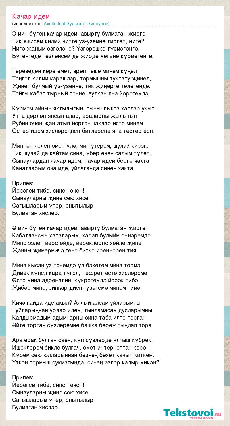 Ә мин бүген качар идем, авырту булмаган җиргә Тик яшисем килми читтә уз-уземне тиргәп, нигә? Нигә җаным өзгәләнә? Үзгәрешкә түзмәгәнгә. Бүгенгедә тезләнсәм дә җирдә мәгьнә күрмәгәнгә. Тәрәзәдән керә өмет, эреп төшә минем күңел Тәңгәл килми карашлар, тормышны туктату җиңел, Җиңеп булмый үз-үзеңне, тик җиңәргә теләгәндә. Тойгы кабат тырный тәнне, вулкан яна йөрәгемдә Күрмәм айның яктылыгын, тынычлыкта хатлар укып Утта дөрләп янсын алар, араларны җылытып Рубин өчен җан атып йөргән чаклар истә минем Өстәр идем хисләреңнең битләренә яңа төстәр өеп. Миннән колеп омет үлә, мин утерэм, шулай кирэк. Тик шулай да кайтам сина, үбәр өчен салым түләп. Сынаулардан качар идем, начар идем бергә чакта Канатларым оча иде, уйлаганда синең хакта Припев: Йөрәгем тибә, синең өчен! Сынауларны җиңә сөю хисе Сагышларым үтәр, онытылыр Булмаган хисләр. Ә мин бүген качар идем, авырту булмаган җиргә Кабатлансын хаталарым, харап булыйм өннәремдә Мине эзләп йөре әйдә, йөрәкләрне хәйлә җиңә Җанны җимермичә генә биткә иреннәрең тия Миңа кысан уз тәнемдә үз бәхетем миңа төрмә Димәк күңел кара түгел, нәфрәт өстә хисләремә Өстә миңа адреналин, күкрәгемдә йөрәк тибә, Җибәр мине, зинһар диеп, үзәгемә минем тимә. Кичә кайда иде акыл? Аклый алсам уйларымны Туйларыңнан урлар идем, тыңламасам дусларымны Калдырмадым адымнарны сиңа таба илтә торган Әйтә торган сүзләремне башка берәү тыңлап тора Ара ерак булган саен, күп сүзләрдә ялгыш күбрәк. Ишекләрем бикле булгач, өмет интернеттан керә Күрәм сөю юлларыннан безнең бәхет качып киткән. Үткән тормыш сукмагында, синең эзләр калыр микән? Припев: Йөрәгем тибә, синең өчен! Сынауларны җиңә сөю хисе Сагышларым үтәр, онытылыр Булмаган хисләр.