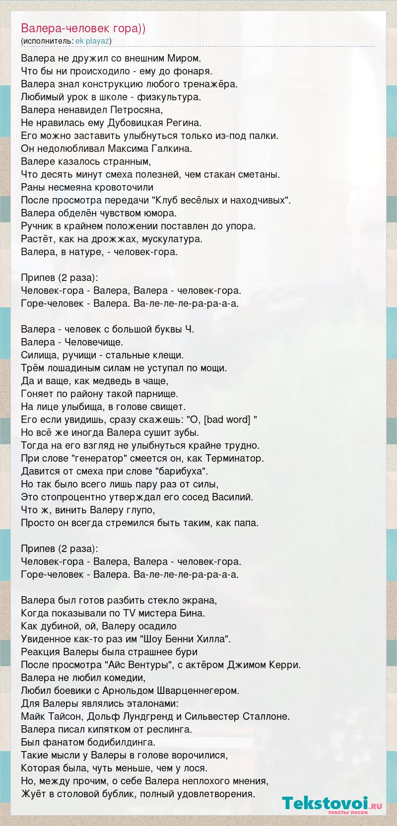 Валера не дружил со внешним Миром. Что бы ни происходило - ему до фонаря. Валера знал конструкцию любого тренажёра. Любимый урок в школе - физкультура. Валера ненавидел Петросяна, Не нравилась ему Дубовицкая Регина. Его можно заставить улыбнуться только из-под палки. Он недолюбливал Максима Галкина. Валере казалось странным, Что десять минут смеха полезней, чем стакан сметаны. Раны несмеяна кровоточили После просмотра передачи "Клуб весёлых и находчивых". Валера обделён чувством юмора. Ручник в крайнем положении поставлен до упора. Растёт, как на дрожжах, мускулатура. Валера, в натуре, - человек-гора. Припев (2 раза): Человек-гора - Валера, Валера - человек-гора. Горе-человек - Валера. Ва-ле-ле-ле-ра-ра-а-а. Валера - человек с большой буквы Ч. Валера - Человечище. Силища, ручищи - стальные клещи. Трём лошадиным силам не уступал по мощи. Да и ваще, как медведь в чаще, Гоняет по району такой парнище. На лице улыбища, в голове свищет. Его если увидишь, сразу скажешь: "О, [bad word] " Но всё же иногда Валера сушит зубы. Тогда на его взгляд не улыбнуться крайне трудно. При слове "генератор" смеется он, как Терминатор. Давится от смеха при слове "барибуха". Но так было всего лишь пару раз от силы, Это стопроцентно утверждал его сосед Василий. Что ж, винить Валеру глупо, Просто он всегда стремился быть таким, как папа. Припев (2 раза): Человек-гора - Валера, Валера - человек-гора. Горе-человек - Валера. Ва-ле-ле-ле-ра-ра-а-а. Валера был готов разбить стекло экрана, Когда показывали по TV мистера Бина. Как дубиной, ой, Валеру осадило Увиденное как-то раз им "Шоу Бенни Хилла". Реакция Валеры была страшнее бури После просмотра "Айс Вентуры", с актёром Джимом Керри. Валера не любил комедии, Любил боевики с Арнольдом Шварценнегером. Для Валеры являлись эталонами: Майк Тайсон, Дольф Лундгренд и Сильвестер Сталлоне. Валера писал кипятком от реслинга. Был фанатом бодибилдинга. Такие мысли у Валеры в голове ворочилися, Которая была, чуть меньше, чем у лося. Но, между прочим, о себе Валера неплохого мнения, Жуёт в столовой бублик, полный удовлетворения.