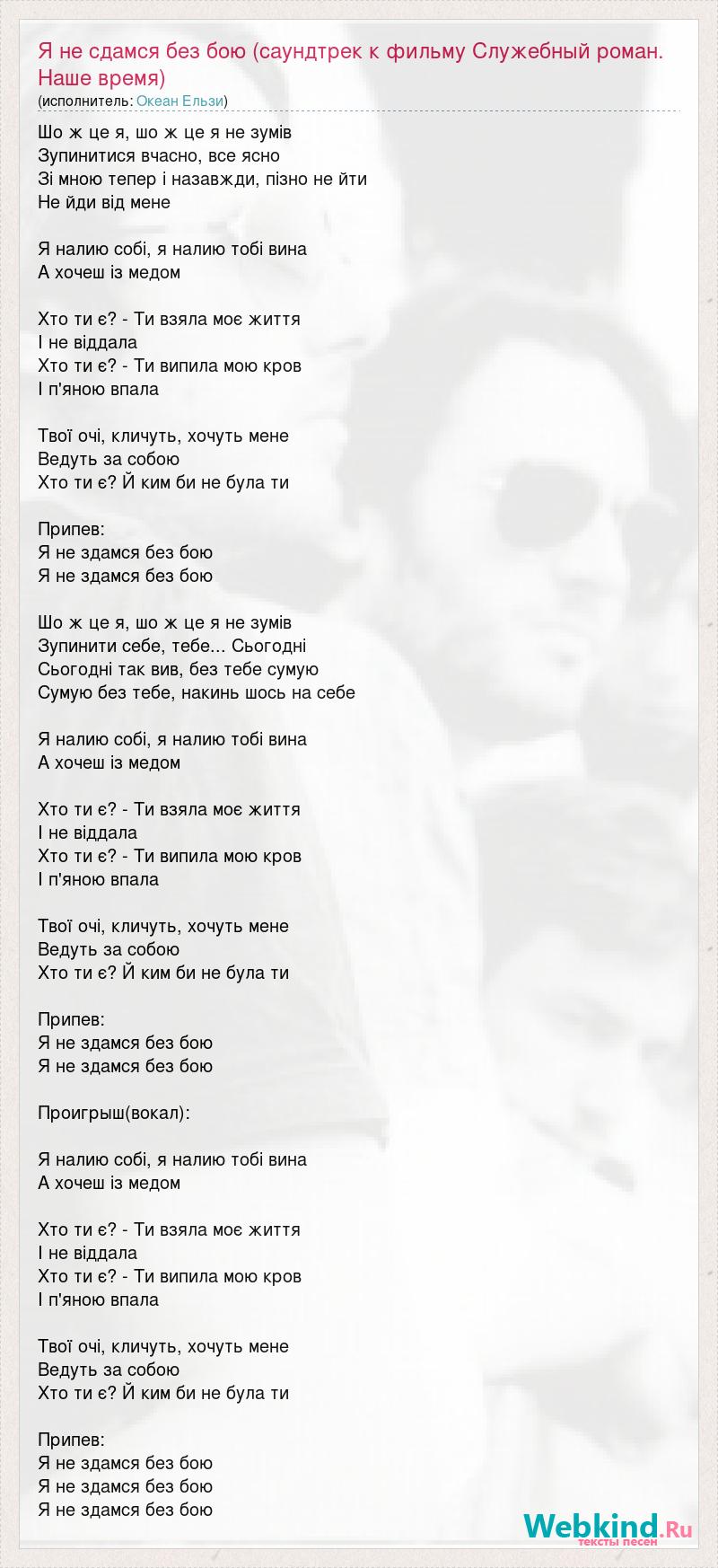 Шо ж це я, шо ж це я не зумів Зупинитися вчасно, все ясно Зі мною тепер і назавжди, пізно не йти Не йди від мене Я налию собі, я налию тобі вина А хочеш із медом Хто ти є? - Ти взяла моє життя І не віддала Хто ти є? - Ти випила мою кров І п'яною впала Твої очі, кличуть, хочуть мене Ведуть за собою Хто ти є? Й ким би не була ти Припев: Я не здамся без бою Я не здамся без бою Шо ж це я, шо ж це я не зумів Зупинити себе, тебе... Сьогодні Сьогодні так вив, без тебе сумую Сумую без тебе, накинь шось на себе Я налию собі, я налию тобі вина А хочеш із медом Хто ти є? - Ти взяла моє життя І не віддала Хто ти є? - Ти випила мою кров І п'яною впала Твої очі, кличуть, хочуть мене Ведуть за собою Хто ти є? Й ким би не була ти Припев: Я не здамся без бою Я не здамся без бою Проигрыш(вокал): Я налию собі, я налию тобі вина А хочеш із медом Хто ти є? - Ти взяла моє життя І не віддала Хто ти є? - Ти випила мою кров І п'яною впала Твої очі, кличуть, хочуть мене Ведуть за собою Хто ти є? Й ким би не була ти Припев: Я не здамся без бою Я не здамся без бою Я не здамся без бою