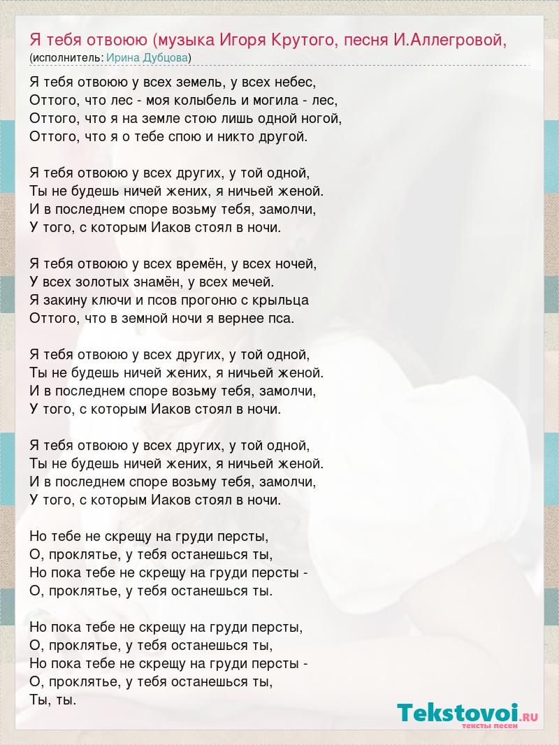 Я тебя отвоюю у всех земель, у всех небес, Оттого, что лес - моя колыбель и могила - лес, Оттого, что я на земле стою лишь одной ногой, Оттого, что я о тебе спою и никто другой. Я тебя отвоюю у всех других, у той одной, Ты не будешь ничей жених, я ничьей женой. И в последнем споре возьму тебя, замолчи, У того, с которым Иаков стоял в ночи. Я тебя отвоюю у всех времён, у всех ночей, У всех золотых знамён, у всех мечей. Я закину ключи и псов прогоню с крыльца Оттого, что в земной ночи я вернее пса. Я тебя отвоюю у всех других, у той одной, Ты не будешь ничей жених, я ничьей женой. И в последнем споре возьму тебя, замолчи, У того, с которым Иаков стоял в ночи. Я тебя отвоюю у всех других, у той одной, Ты не будешь ничей жених, я ничьей женой. И в последнем споре возьму тебя, замолчи, У того, с которым Иаков стоял в ночи. Но тебе не скрещу на груди персты, О, проклятье, у тебя останешься ты, Но пока тебе не скрещу на груди персты - О, проклятье, у тебя останешься ты. Но пока тебе не скрещу на груди персты, О, проклятье, у тебя останешься ты, Но пока тебе не скрещу на груди персты - О, проклятье, у тебя останешься ты, Ты, ты.
