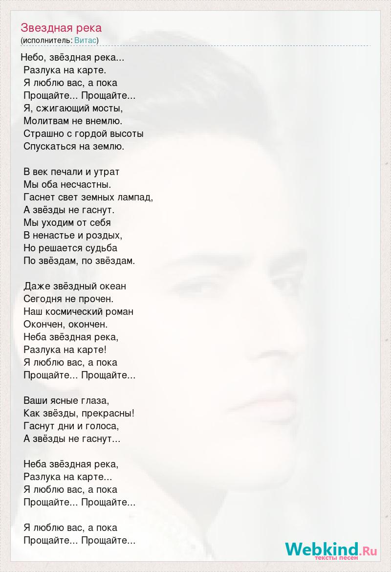Небо, звёздная река... Разлука на карте. Я люблю вас, а пока Прощайте... Прощайте... Я, сжигающий мосты, Молитвам не внемлю. Страшно с гордой высоты Спускаться на землю. В век печали и утрат Мы оба несчастны. Гаснет свет земных лампад, А звёзды не гаснут. Мы уходим от себя В ненастье и роздых, Но решается судьба По звёздам, по звёздам. Даже звёздный океан Сегодня не прочен. Наш космический роман Окончен, окончен. Неба звёздная река, Разлука на карте! Я люблю вас, а пока Прощайте... Прощайте... Ваши ясные глаза, Как звёзды, прекрасны! Гаснут дни и голоса, А звёзды не гаснут... Неба звёздная река, Разлука на карте... Я люблю вас, а пока Прощайте... Прощайте... Я люблю вас, а пока Прощайте... Прощайте...