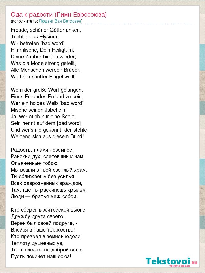 Freude, schöner Götterfunken, Tochter aus Elysium! Wir betreten feuertrunken, Himmlische, Dein Heiligtum. Deine Zauber binden wieder, Was die Mode streng geteilt, Alle Menschen werden Brüder, Wo Dein sanfter Flügel weilt. Wem der große Wurf gelungen, Eines Freundes Freund zu sein, Wer ein holdes Weib errungen, Mische seinen Jubel ein! Ja, wer auch nur eine Seele Sein nennt auf dem Erdenrund! Und wer’s nie gekonnt, der stehle Weinend sich aus diesem Bund! Радость, пламя неземное, Райский дух, слетевший к нам, Опьяненные тобою, Мы вошли в твой светлый храм. Ты сближаешь без усилья Всех разрозненных враждой, Там, где ты раскинешь крылья, Люди — братья меж собой. Кто сберёг в житейской вьюге Дружбу друга своего, Верен был своей подруге, - Влейся в наше торжество! Кто презрел в земной юдоли Теплоту душевных уз, Тот в слезах, по доброй воле, Пусть покинет наш союз!