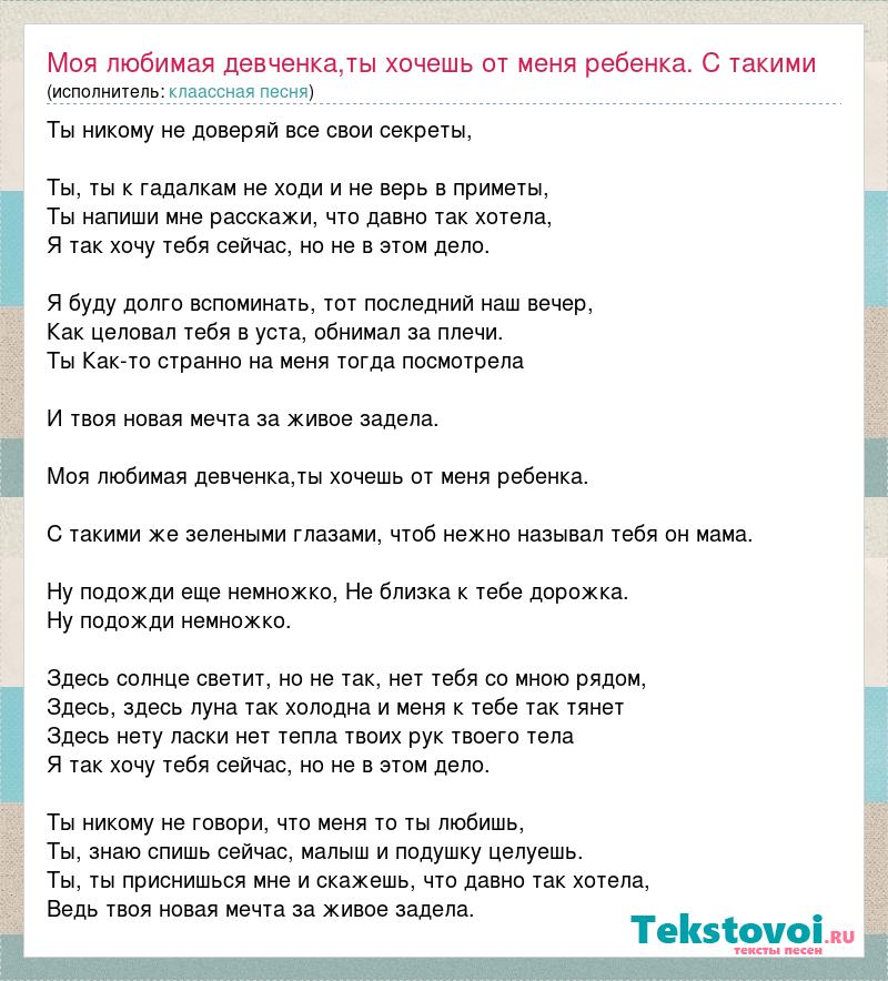 Ты никому не доверяй все свои секреты, Ты, ты к гадалкам не ходи и не верь в приметы, Ты напиши мне расскажи, что давно так хотела, Я так хочу тебя сейчас, но не в этом дело. Я буду долго вспоминать, тот последний наш вечер, Как целовал тебя в уста, обнимал за плечи. Ты Как-то странно на меня тогда посмотрела И твоя новая мечта за живое задела. Моя любимая девченка,ты хочешь от меня ребенка. С такими же зелеными глазами, чтоб нежно называл тебя он мама. Ну подожди еще немножко, Не близка к тебе дорожка. Ну подожди немножко. Здесь солнце светит, но не так, нет тебя со мною рядом, Здесь, здесь луна так холодна и меня к тебе так тянет Здесь нету ласки нет тепла твоих рук твоего тела Я так хочу тебя сейчас, но не в этом дело. Ты никому не говори, что меня то ты любишь, Ты, знаю спишь сейчас, малыш и подушку целуешь. Ты, ты приснишься мне и скажешь, что давно так хотела, Ведь твоя новая мечта за живое задела.