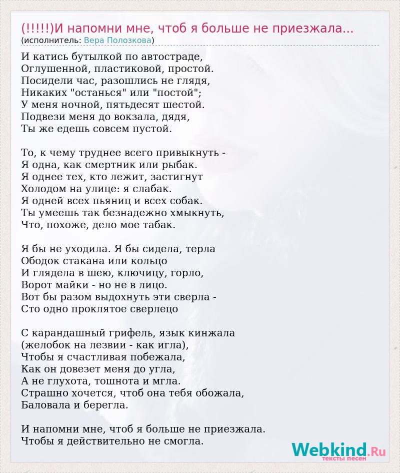 А как ты думаешь, о чем песня "(!!!!!)И напомни мне, чтоб я больше не приезжала..." ?