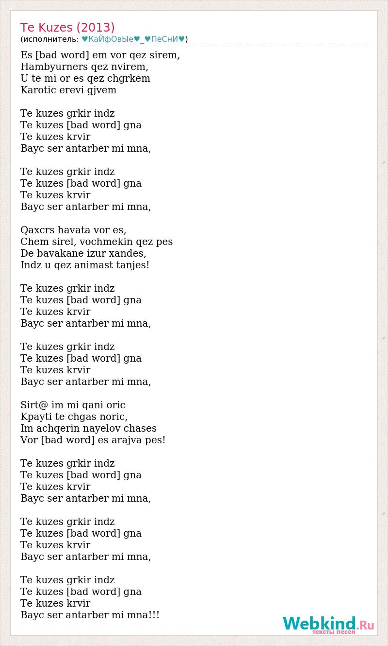 Es [bad word] em vor qez sirem, Hambyurners qez nvirem, U te mi or es qez chgrkem Karotic erevi gjvem Te kuzes grkir indz Te kuzes [bad word] gna Te kuzes krvir Bayc ser antarber mi mna, Te kuzes grkir indz Te kuzes [bad word] gna Te kuzes krvir Bayc ser antarber mi mna, Qaxcrs havata vor es, Chem sirel, vochmekin qez pes De bavakane izur xandes, Indz u qez animast tanjes! Te kuzes grkir indz Te kuzes [bad word] gna Te kuzes krvir Bayc ser antarber mi mna, Te kuzes grkir indz Te kuzes [bad word] gna Te kuzes krvir Bayc ser antarber mi mna, Sirt@ im mi qani oric Kpayti te chgas noric, Im achqerin nayelov chases Vor [bad word] es arajva pes! Te kuzes grkir indz Te kuzes [bad word] gna Te kuzes krvir Bayc ser antarber mi mna, Te kuzes grkir indz Te kuzes [bad word] gna Te kuzes krvir Bayc ser antarber mi mna, Te kuzes grkir indz Te kuzes [bad word] gna Te kuzes krvir Bayc ser antarber mi mna!!!