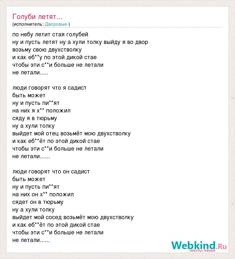 по небу летит стая голубей ну и пусть летят ну а хули толку выйду я во двор возьму свою двухстволку и как еб**у по этой дикой стае чтобы эти с**и больше не летали не летали..... люди говорят что я садист быть может ну и пусть пи**ят на них я х** положил сяду я в тюрьму ну а хули толку выйдет мой отец возьмёт мою двухстволку и как еб**ёт по этой дикой стае чтобы эти с**и больше не летали не летали...... люди говорят что он садист быть может ну и пусть пи**ят на них он х** положил сядет он в тюрьму ну а хули толку выйдет мой сосед возьмёт мою двухстволку и как еб**ёт по этой дикой стае чтобы эти с**и больше не летали не летали......