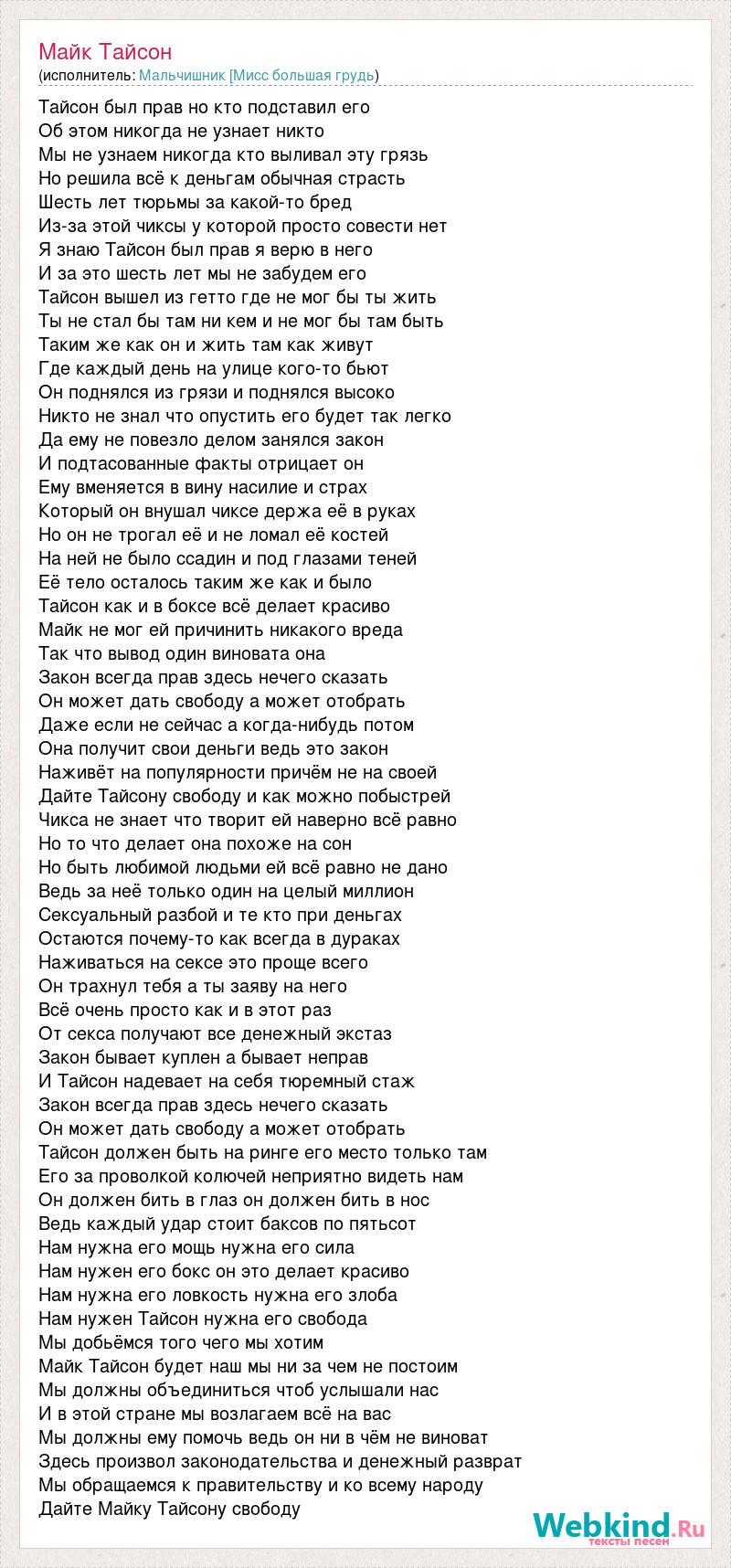 Тайсон был прав но кто подставил его Об этом никогда не узнает никто Мы не узнаем никогда кто выливал эту грязь Но решила всё к деньгам обычная страсть Шесть лет тюрьмы за какой-то бред Из-за этой чиксы у которой просто совести нет Я знаю Тайсон был прав я верю в него И за это шесть лет мы не забудем его Тайсон вышел из гетто где не мог бы ты жить Ты не стал бы там ни кем и не мог бы там быть Таким же как он и жить там как живут Где каждый день на улице кого-то бьют Он поднялся из грязи и поднялся высоко Никто не знал что опустить его будет так легко Да ему не повезло делом занялся закон И подтасованные факты отрицает он Ему вменяется в вину насилие и страх Который он внушал чиксе держа её в руках Но он не трогал её и не ломал её костей На ней не было ссадин и под глазами теней Её тело осталось таким же как и было Тайсон как и в боксе всё делает красиво Майк не мог ей причинить никакого вреда Так что вывод один виновата она Закон всегда прав здесь нечего сказать Он может дать свободу а может отобрать Даже если не сейчас а когда-нибудь потом Она получит свои деньги ведь это закон Наживёт на популярности причём не на своей Дайте Тайсону свободу и как можно побыстрей Чикса не знает что творит ей наверно всё равно Но то что делает она похоже на сон Но быть любимой людьми ей всё равно не дано Ведь за неё только один на целый миллион Сексуальный разбой и те кто при деньгах Остаются почему-то как всегда в дураках Наживаться на сексе это проще всего Он трахнул тебя а ты заяву на него Всё очень просто как и в этот раз От секса получают все денежный экстаз Закон бывает куплен а бывает неправ И Тайсон надевает на себя тюремный стаж Закон всегда прав здесь нечего сказать Он может дать свободу а может отобрать Тайсон должен быть на ринге его место только там Его за проволкой колючей неприятно видеть нам Он должен бить в глаз он должен бить в нос Ведь каждый удар стоит баксов по пятьсот Нам нужна его мощь нужна его сила Нам нужен его бокс он это делает красиво Нам нужна его ловкость нужна его злоба Нам нужен Тайсон нужна его свобода Мы добьёмся того чего мы хотим Майк Тайсон будет наш мы ни за чем не постоим Мы должны объединиться чтоб услышали нас И в этой стране мы возлагаем всё на вас Мы должны ему помочь ведь он ни в чём не виноват Здесь произвол законодательства и денежный разврат Мы обращаемся к правительству и ко всему народу Дайте Майку Тайсону свободу