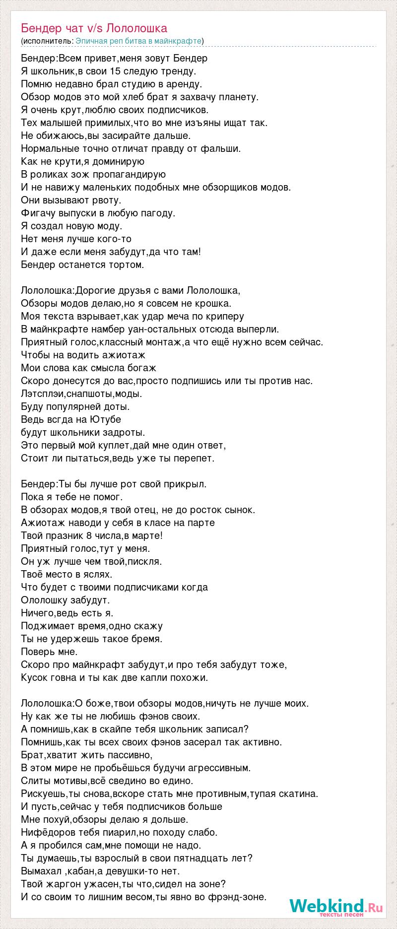 Бендер:Всем привет,меня зовут Бендер Я школьник,в свои 15 следую тренду. Помню недавно брал студию в аренду. Обзор модов это мой хлеб брат я захвачу планету. Я очень крут,люблю своих подписчиков. Тех малышей примилых,что во мне изъяны ищат так. Не обижаюсь,вы засирайте дальше. Нормальные точно отличат правду от фальши. Как не крути,я доминирую В роликах зож пропагандирую И не навижу маленьких подобных мне обзорщиков модов. Они вызывают рвоту. Фигачу выпуски в любую пагоду. Я создал новую моду. Нет меня лучше кого-то И даже если меня забудут,да что там! Бендер останется тортом. Лололошка:Дорогие друзья с вами Лололошка, Обзоры модов делаю,но я совсем не крошка. Моя текста взрывает,как удар меча по криперу В майнкрафте намбер уан-остальных отсюда выперли. Приятный голос,классный монтаж,а что ещё нужно всем сейчас. Чтобы на водить ажиотаж Мои слова как смысла богаж Скоро донесутся до вас,просто подпишись или ты против нас. Лэтсплэи,снапшоты,моды. Буду популярней доты. Ведь всгда на Ютубе будут школьники задроты. Это первый мой куплет,дай мне один ответ, Стоит ли пытаться,ведь уже ты перепет. Бендер:Ты бы лучше рот свой прикрыл. Пока я тебе не помог. В обзорах модов,я твой отец, не до росток сынок. Ажиотаж наводи у себя в класе на парте Твой празник 8 числа,в марте! Приятный голос,тут у меня. Он уж лучше чем твой,пискля. Твоё место в яслях. Что будет с твоими подписчиками когда Ололошку забудут. Ничего,ведь есть я. Поджимает время,одно скажу Ты не удержешь такое бремя. Поверь мне. Скоро про майнкрафт забудут,и про тебя забудут тоже, Кусок говна и ты как две капли похожи. Лололошка:О боже,твои обзоры модов,ничуть не лучше моих. Ну как же ты не любишь фэнов своих. А помнишь,как в скайпе тебя школьник записал? Помнишь,как ты всех своих фэнов засерал так активно. Брат,хватит жить пассивно, В этом мире не пробьёшься будучи агрессивным. Слиты мотивы,всё сведино во едино. Рискуешь,ты снова,вскоре стать мне противным,тупая скатина. И пусть,сейчас у тебя подписчиков больше Мне похуй,обзоры делаю я дольше. Нифёдоров тебя пиарил,но походу слабо. А я пробился сам,мне помощи не надо. Ты думаешь,ты взрослый в свои пятнадцать лет? Вымахал ,кабан,а девушки-то нет. Твой жаргон ужасен,ты что,сидел на зоне? И со своим то лишним весом,ты явно во фрэнд-зоне.