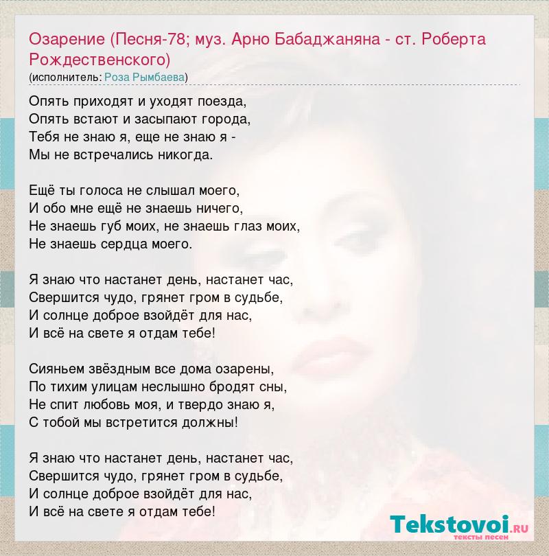 Опять приходят и уходят поезда, Опять встают и засыпают города, Тебя не знаю я, еще не знаю я - Мы не встречались никогда. Ещё ты голоса не слышал моего, И обо мне ещё не знаешь ничего, Не знаешь губ моих, не знаешь глаз моих, Не знаешь сердца моего. Я знаю что настанет день, настанет час, Свершится чудо, грянет гром в судьбе, И солнце доброе взойдёт для нас, И всё на свете я отдам тебе! Сияньем звёздным все дома озарены, По тихим улицам неслышно бродят сны, Не спит любовь моя, и твердо знаю я, С тобой мы встретится должны! Я знаю что настанет день, настанет час, Свершится чудо, грянет гром в судьбе, И солнце доброе взойдёт для нас, И всё на свете я отдам тебе!