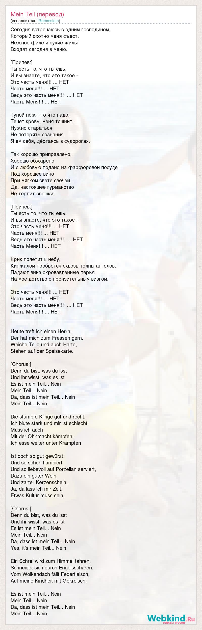 Сегодня встречаюсь с одним господином, Который охотно меня съест. Нежное филе и сухие жилы Входят сегодня в меню. [Припев:] Ты есть то, что ты ешь, И вы знаете, что это такое - Это часть меня!!! ... НЕТ Часть меня!!! ... НЕТ Ведь это часть меня!!! ... НЕТ Часть Меня!!! ... НЕТ Тупой нож - то что надо, Течет кровь, меня тошнит, Нужно стараться Не потерять сознания. Я ем себя, дёргаясь в судорогах. Так хорошо приправлено, Хорошо обжарено И с любовью подано на фарфоровой посуде Под хорошее вино При мягком свете свечей... Да, настоящее гурманство Не терпит спешки. [Припев:] Ты есть то, что ты ешь, И вы знаете, что это такое - Это часть меня!!! ... НЕТ Часть меня!!! ... НЕТ Ведь это часть меня!!! ... НЕТ Часть Меня!!! ... НЕТ Крик полетит к небу, Кинжалом пробьётся сквозь толпы ангелов. Падают вниз окровавленные перья На моё детство с пронзительным визгом. Это часть меня!!! ... НЕТ Часть меня!!! ... НЕТ Ведь это часть меня!!! ... НЕТ Часть Меня!!! ... НЕТ ____________________________________ Heute treff ich einen Herrn, Der hat mich zum Fressen gern. Weiche Teile und auch Harte, Stehen auf der Speisekarte. [Chorus:] Denn du bist, was du isst Und ihr wisst, was es ist Es ist mein Teil... Nein Mein Teil... Nein Da, dass ist mein Teil... Nein Mein Teil... Nein Die stumpfe Klinge gut und recht, Ich blute stark und mir ist schlecht. Muss ich auch Mit der Ohnmacht kämpfen, Ich esse weiter unter Krämpfen Ist doch so gut gewürzt Und so schön flambiert Und so liebevoll auf Porzellan serviert, Dazu ein guter Wein Und zarter Kerzenschein, Ja, da lass ich mir Zeit, Etwas Kultur muss sein [Chorus:] Denn du bist, was du isst Und ihr wisst, was es ist Es ist mein Teil... Nein Mein Teil... Nein Da, dass ist mein Teil... Nein Yes, it’s mein Teil... Nein Ein Schrei wird zum Himmel fahren, Schneidet sich durch Engelsscharen. Vom Wolkendach fällt Federfleisch, Auf meine Kindheit mit Gekreisch. Es ist mein Teil... Nein Mein Teil... Nein Da, dass ist mein Teil... Nein Mein Teil... Nein