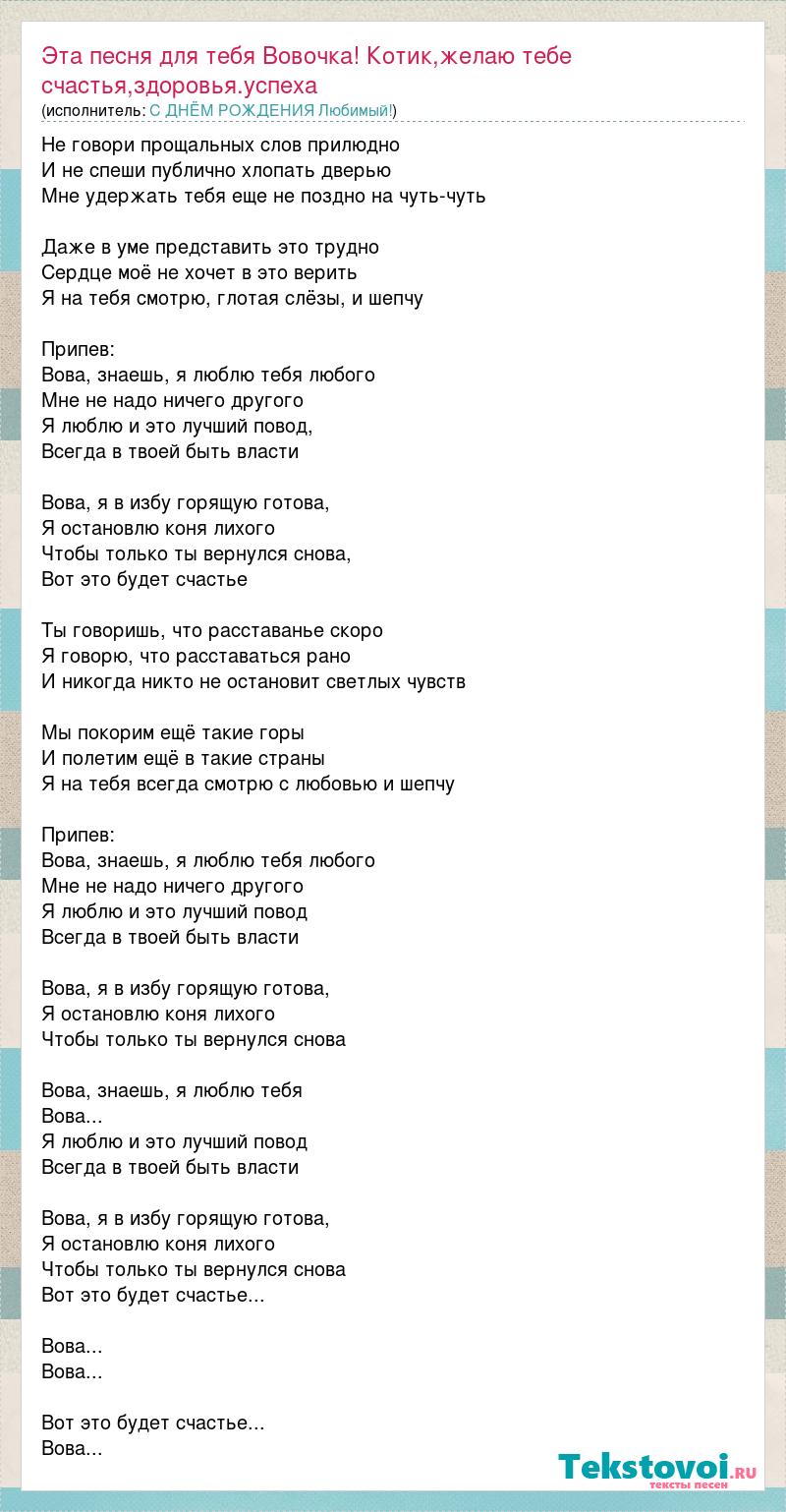 Не говори прощальных слов прилюдно И не спеши публично хлопать дверью Мне удержать тебя еще не поздно на чуть-чуть Даже в уме представить это трудно Сердце моё не хочет в это верить Я на тебя смотрю, глотая слёзы, и шепчу Припев: Вова, знаешь, я люблю тебя любого Мне не надо ничего другого Я люблю и это лучший повод, Всегда в твоей быть власти Вова, я в избу горящую готова, Я остановлю коня лихого Чтобы только ты вернулся снова, Вот это будет счастье Ты говоришь, что расставанье скоро Я говорю, что расставаться рано И никогда никто не остановит светлых чувств Мы покорим ещё такие горы И полетим ещё в такие страны Я на тебя всегда смотрю с любовью и шепчу Припев: Вова, знаешь, я люблю тебя любого Мне не надо ничего другого Я люблю и это лучший повод Всегда в твоей быть власти Вова, я в избу горящую готова, Я остановлю коня лихого Чтобы только ты вернулся снова Вова, знаешь, я люблю тебя Вова... Я люблю и это лучший повод Всегда в твоей быть власти Вова, я в избу горящую готова, Я остановлю коня лихого Чтобы только ты вернулся снова Вот это будет счастье... Вова... Вова... Вот это будет счастье... Вова...