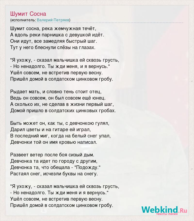 Шумит сосна, река жемчужная течёт, А вдоль реки парнишка с девушкой идёт. Они идут, все замедляя быстрый шаг. Тут у него блеснули слёзы на глазах. "Я ухожу, - сказал мальчишка ей сквозь грусть, - Но ненадолго. Ты жди меня, и я вернусь." Ушёл совсем, не встретив первую весну. Пришёл домой в солдатском цинковом гробу. Рыдает мать, и словно тень стоит отец, Ведь он совсем, он был совсем ещё юнец. А сколько их, не сделав в жизни первый шаг, Домой пришло в солдатских цинковых гробах. Быть может он, как ты, с девчонкою гулял, Дарил цветы и на гитаре ей играл, В последний миг, когда на белый снег упал, Девчонки той он имя кровью написал. Развеет ветер после боя сизый дым. Девчонка та идет по городу с другим, Девчонка та, что обещала - "Подожду." Растаял снег, исчезли буквы на снегу. "Я ухожу, - сказал мальчишка ей сквозь грусть, - Но ненадолго. Ты жди меня и я вернусь." Ушёл совсем, не встретив первую весну. Пришёл домой в солдатском цинковом гробу.