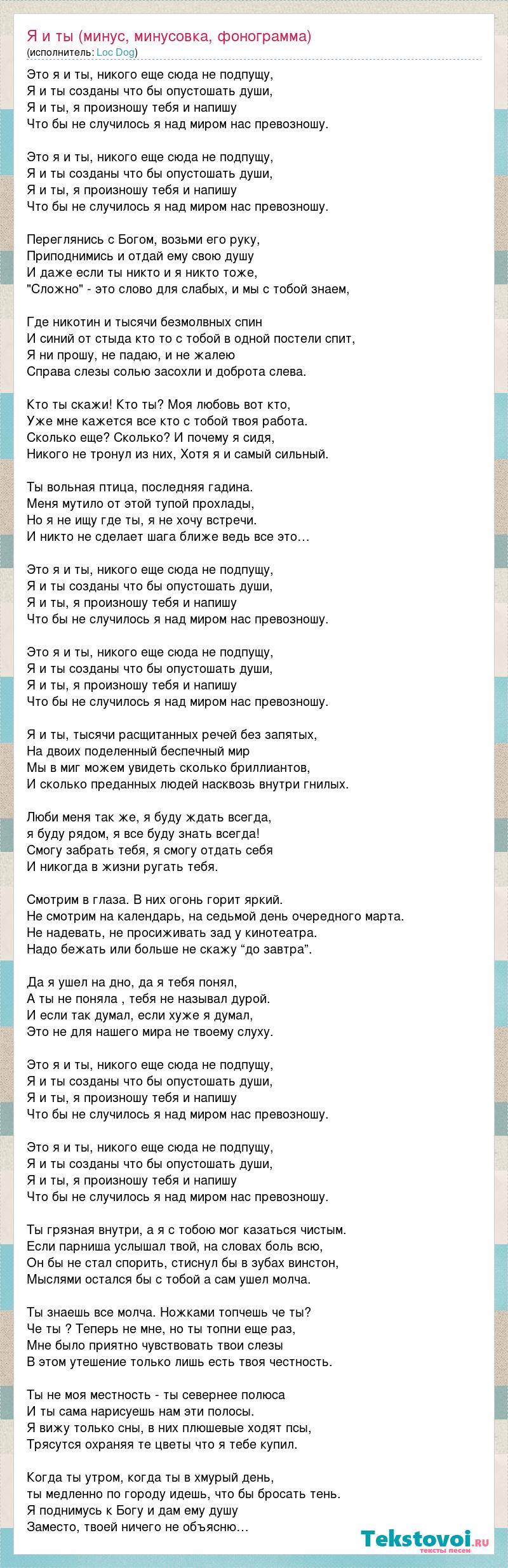 Это я и ты, никого еще сюда не подпущу, Я и ты созданы что бы опустошать души, Я и ты, я произношу тебя и напишу Что бы не случилось я над миром нас превозношу. Это я и ты, никого еще сюда не подпущу, Я и ты созданы что бы опустошать души, Я и ты, я произношу тебя и напишу Что бы не случилось я над миром нас превозношу. Переглянись с Богом, возьми его руку, Приподнимись и отдай ему свою душу И даже если ты никто и я никто тоже, "Сложно" - это слово для слабых, и мы с тобой знаем, Где никотин и тысячи безмолвных спин И синий от стыда кто то с тобой в одной постели спит, Я ни прошу, не падаю, и не жалею Справа слезы солью засохли и доброта слева. Кто ты скажи! Кто ты? Моя любовь вот кто, Уже мне кажется все кто с тобой твоя работа. Сколько еще? Сколько? И почему я сидя, Никого не тронул из них, Хотя я и самый сильный. Ты вольная птица, последняя гадина. Меня мутило от этой тупой прохлады, Но я не ищу где ты, я не хочу встречи. И никто не сделает шага ближе ведь все это… Это я и ты, никого еще сюда не подпущу, Я и ты созданы что бы опустошать души, Я и ты, я произношу тебя и напишу Что бы не случилось я над миром нас превозношу. Это я и ты, никого еще сюда не подпущу, Я и ты созданы что бы опустошать души, Я и ты, я произношу тебя и напишу Что бы не случилось я над миром нас превозношу. Я и ты, тысячи расщитанных речей без запятых, На двоих поделенный беспечный мир Мы в миг можем увидеть сколько бриллиантов, И сколько преданных людей насквозь внутри гнилых. Люби меня так же, я буду ждать всегда, я буду рядом, я все буду знать всегда! Смогу забрать тебя, я смогу отдать себя И никогда в жизни ругать тебя. Смотрим в глаза. В них огонь горит яркий. Не смотрим на календарь, на седьмой день очередного марта. Не надевать, не просиживать зад у кинотеатра. Надо бежать или больше не скажу “до завтра”. Да я ушел на дно, да я тебя понял, А ты не поняла , тебя не называл дурой. И если так думал, если хуже я думал, Это не для нашего мира не твоему слуху. Это я и ты, никого еще сюда не подпущу, Я и ты созданы что бы опустошать души, Я и ты, я произношу тебя и напишу Что бы не случилось я над миром нас превозношу. Это я и ты, никого еще сюда не подпущу, Я и ты созданы что бы опустошать души, Я и ты, я произношу тебя и напишу Что бы не случилось я над миром нас превозношу. Ты грязная внутри, а я с тобою мог казаться чистым. Если парниша услышал твой, на словах боль всю, Он бы не стал спорить, стиснул бы в зубах винстон, Мыслями остался бы с тобой а сам ушел молча. Ты знаешь все молча. Ножками топчешь че ты? Че ты ? Теперь не мне, но ты топни еще раз, Мне было приятно чувствовать твои слезы В этом утешение только лишь есть твоя честность. Ты не моя местность - ты севернее полюса И ты сама нарисуешь нам эти полосы. Я вижу только сны, в них плюшевые ходят псы, Трясутся охраняя те цветы что я тебе купил. Когда ты утром, когда ты в хмурый день, ты медленно по городу идешь, что бы бросать тень. Я поднимусь к Богу и дам ему душу Заместо, твоей ничего не объясню…