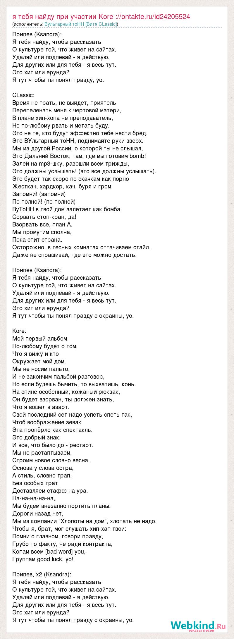 Припев (Ksandra): Я тебя найду, чтобы рассказать О культуре той, что живет на сайтах. Удаляй или подпевай - я действую. Для других или для тебя - я весь тут. Это хит или ерунда? Я тут чтобы ты понял правду, yo. CLassic: Время не трать, не выйдет, приятель Перепеленать меня к чертовой матери, В плане хип-хопа не преподаватель, Но по-любому рвать и метать буду. Это не те, кто будут эффектно тебе нести бред. Это ВУльгарный тоНН, поднимайте руки вверх. Мы из другой России, о которой ты не слышал, Это Дальний Восток, там, где мы готовим bomb! Залей на mp3-шку, разошли всем трижды, Это должны услышать! (это все должны услышать). Это будет так скоро по скачкам как порно Жесткач, хардкор, кач, буря и гром. Запомни! (запомни) По полной! (по полной) ВуТоНН в твой дом залетает как бомба. Сорвать стоп-кран, да! Взорвать все, план А. Мы промутим сполна, Пока спит страна. Осторожно, в тесных комнатах оттачиваем стайл. Даже не спрашивай, где это можно достать. Припев (Ksandra): Я тебя найду, чтобы рассказать О культуре той, что живет на сайтах. Удаляй или подпевай - я действую. Для других или для тебя - я весь тут. Это хит или ерунда? Я тут чтобы ты понял правду с окраины, yo. Kore: Мой первый альбом По-любому будет о том, Что я вижу и кто Окружает мой дом. Мы не носим пальто, И не закончим пальбой разговор, Но если будешь бычить, то выхватишь, конь. На спине особенный, кожаный рюкзак, Он будет взорван, ты должен знать, Что я вошел в азарт. Свой последний сет надо успеть спеть так, Чтоб воображение зевак Эта пропёрло как спектакль. Это добрый знак. И все, что было до - рестарт. Мы не растаптываем, Строим новое словно весна. Основа у слова остра, А стиль, словно трап, Без особых трат Доставляем стафф на ура. На-на-на-на-на, Мы будем внезапно портить планы. Дороги назад нет, Мы из компании "Хлопоты на дом", хлопать не надо. Чтобы я, брат, мог слушать хип-хап твой: Помни о главном, говори правду, Грубо по факту, не ради контракта, Копам всем [bad word] you, Группам good luck, yo! Припев, х2 (Ksandra): Я тебя найду, чтобы рассказать О культуре той, что живет на сайтах. Удаляй или подпевай - я действую. Для других или для тебя - я весь тут. Это хит или ерунда? Я тут чтобы ты понял правду с окраины, yo.