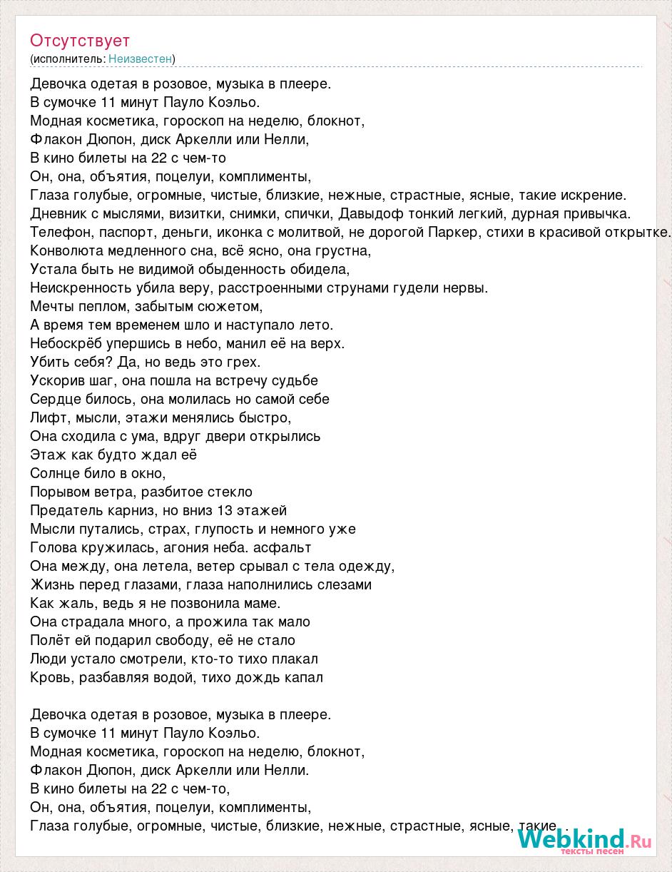 Девочка одетая в розовое, музыка в плеере. В сумочке 11 минут Пауло Коэльо. Модная косметика, гороскоп на неделю, блокнот, Флакон Дюпон, диск Аркелли или Нелли, В кино билеты на 22 с чем-то Он, она, объятия, поцелуи, комплименты, Глаза голубые, огромные, чистые, близкие, нежные, страстные, ясные, такие искрение. Дневник с мыслями, визитки, снимки, спички, Давыдоф тонкий легкий, дурная привычка. Телефон, паспорт, деньги, иконка с молитвой, не дорогой Паркер, стихи в красивой открытке. Конволюта медленного сна, всё ясно, она грустна, Устала быть не видимой обыденность обидела, Неискренность убила веру, расстроенными струнами гудели нервы. Мечты пеплом, забытым сюжетом, А время тем временем шло и наступало лето. Небоскрёб упершись в небо, манил её на верх. Убить себя? Да, но ведь это грех. Ускорив шаг, она пошла на встречу судьбе Сердце билось, она молилась но самой себе Лифт, мысли, этажи менялись быстро, Она сходила с ума, вдруг двери открылись Этаж как будто ждал её Солнце било в окно, Порывом ветра, разбитое стекло Предатель карниз, но вниз 13 этажей Мысли путались, страх, глупость и немного уже Голова кружилась, агония неба. асфальт Она между, она летела, ветер срывал с тела одежду, Жизнь перед глазами, глаза наполнились слезами Как жаль, ведь я не позвонила маме. Она страдала много, а прожила так мало Полёт ей подарил свободу, её не стало Люди устало смотрели, кто-то тихо плакал Кровь, разбавляя водой, тихо дождь капал Девочка одетая в розовое, музыка в плеере. В сумочке 11 минут Пауло Коэльо. Модная косметика, гороскоп на неделю, блокнот, Флакон Дюпон, диск Аркелли или Нелли. В кино билеты на 22 с чем-то, Он, она, объятия, поцелуи, комплименты, Глаза голубые, огромные, чистые, близкие, нежные, страстные, ясные, такие. . .