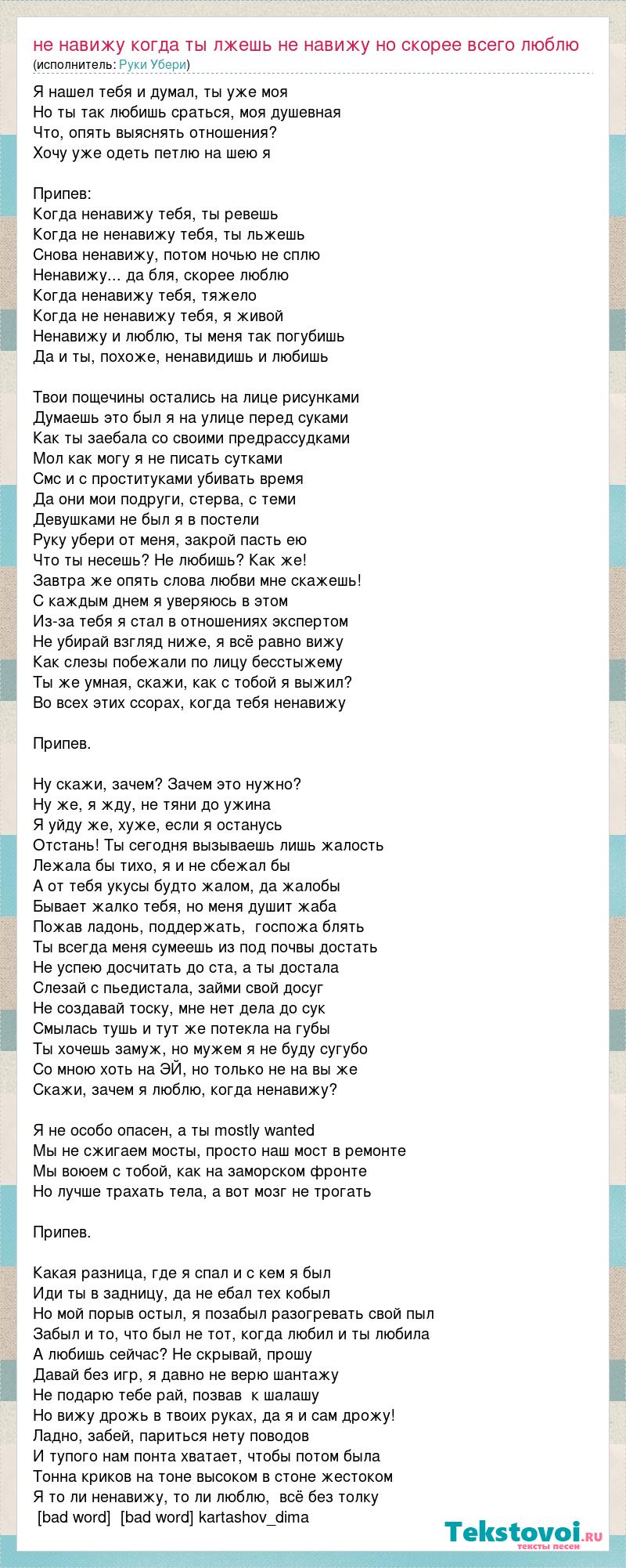 Я нашел тебя и думал, ты уже моя Но ты так любишь сраться, моя душевная Что, опять выяснять отношения? Хочу уже одеть петлю на шею я Припев: Когда ненавижу тебя, ты ревешь Когда не ненавижу тебя, ты льжешь Снова ненавижу, потом ночью не сплю Ненавижу... да бля, скорее люблю Когда ненавижу тебя, тяжело Когда не ненавижу тебя, я живой Ненавижу и люблю, ты меня так погубишь Да и ты, похоже, ненавидишь и любишь Твои пощечины остались на лице рисунками Думаешь это был я на улице перед суками Как ты заебала со своими предрассудками Мол как могу я не писать сутками Смс и с проституками убивать время Да они мои подруги, стерва, с теми Девушками не был я в постели Руку убери от меня, закрой пасть ею Что ты несешь? Не любишь? Как же! Завтра же опять слова любви мне скажешь! С каждым днем я уверяюсь в этом Из-за тебя я стал в отношениях экспертом Не убирай взгляд ниже, я всё равно вижу Как слезы побежали по лицу бесстыжему Ты же умная, скажи, как с тобой я выжил? Во всех этих ссорах, когда тебя ненавижу Припев. Ну скажи, зачем? Зачем это нужно? Ну же, я жду, не тяни до ужина Я уйду же, хуже, если я останусь Отстань! Ты сегодня вызываешь лишь жалость Лежала бы тихо, я и не сбежал бы А от тебя укусы будто жалом, да жалобы Бывает жалко тебя, но меня душит жаба Пожав ладонь, поддержать, госпожа блять Ты всегда меня сумеешь из под почвы достать Не успею досчитать до ста, а ты достала Слезай с пьедистала, займи свой досуг Не создавай тоску, мне нет дела до сук Смылась тушь и тут же потекла на губы Ты хочешь замуж, но мужем я не буду сугубо Со мною хоть на ЭЙ, но только не на вы же Скажи, зачем я люблю, когда ненавижу? Я не особо опасен, а ты mostly wanted Мы не сжигаем мосты, просто наш мост в ремонте Мы воюем с тобой, как на заморском фронте Но лучше трахать тела, а вот мозг не трогать Припев. Какая разница, где я спал и с кем я был Иди ты в задницу, да не ебал тех кобыл Но мой порыв остыл, я позабыл разогревать свой пыл Забыл и то, что был не тот, когда любил и ты любила А любишь сейчас? Не скрывай, прошу Давай без игр, я давно не верю шантажу Не подарю тебе рай, позвав к шалашу Но вижу дрожь в твоих руках, да я и сам дрожу! Ладно, забей, париться нету поводов И тупого нам понта хватает, чтобы потом была Тонна криков на тоне высоком в стоне жестоком Я то ли ненавижу, то ли люблю, всё без толку [bad word] [bad word] kartashov_dima