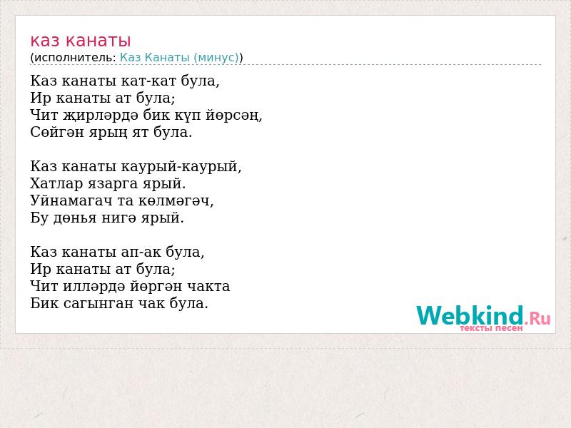 Каз канаты кат-кат була, Ир канаты ат була; Чит җирләрдә бик күп йөрсәң, Сөйгән ярың ят була. Каз канаты каурый-каурый, Хатлар язарга ярый. Уйнамагач та көлмәгәч, Бу дөнья нигә ярый. Каз канаты ап-ак була, Ир канаты ат була; Чит илләрдә йөргән чакта Бик сагынган чак була.