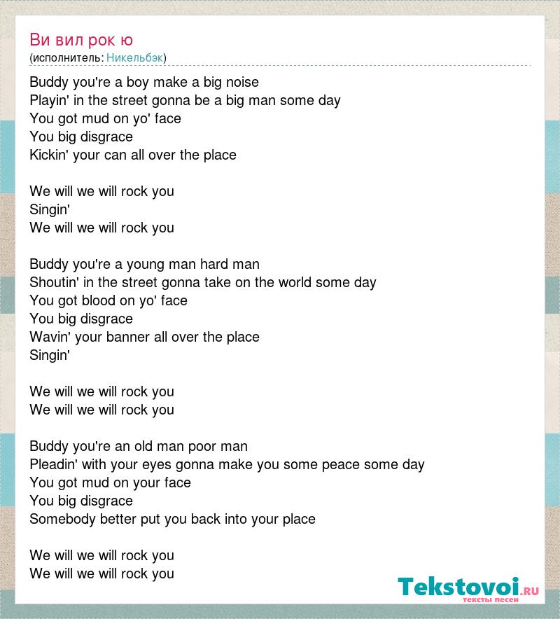 Buddy you're a boy make a big noise Playin' in the street gonna be a big man some day You got mud on yo' face You big disgrace Kickin' your can all over the place We will we will rock you Singin' We will we will rock you Buddy you're a young man hard man Shoutin' in the street gonna take on the world some day You got blood on yo' face You big disgrace Wavin' your banner all over the place Singin' We will we will rock you We will we will rock you Buddy you're an old man poor man Pleadin' with your eyes gonna make you some peace some day You got mud on your face You big disgrace Somebody better put you back into your place We will we will rock you We will we will rock you