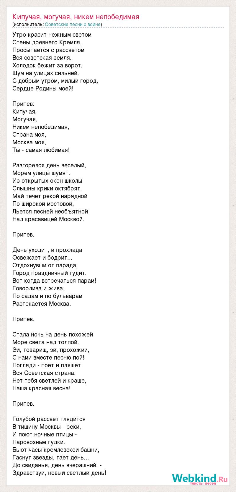 Утро красит нежным светом Стены древнего Кремля, Просыпается с рассветом Вся советская земля. Холодок бежит за ворот, Шум на улицах сильней. С добрым утром, милый город, Сердце Родины моей! Припев: Кипучая, Могучая, Никем непобедимая, Страна моя, Москва моя, Ты - самая любимая! Разгорелся день веселый, Морем улицы шумят. Из открытых окон школы Слышны крики октябрят. Май течет рекой нарядной По широкой мостовой, Льется песней необъятной Над красавицей Москвой. Припев. День уходит, и прохлада Освежает и бодрит... Отдохнувши от парада, Город праздничный гудит. Вот когда встречаться парам! Говорлива и жива, По садам и по бульварам Растекается Москва. Припев. Стала ночь на день похожей Море света над толпой. Эй, товарищ, эй, прохожий, С нами вместе песню пой! Погляди - поет и пляшет Вся Советская страна. Нет тебя светлей и краше, Наша красная весна! Припев. Голубой рассвет глядится В тишину Москвы - реки, И поют ночные птицы - Паровозные гудки. Бьют часы кремлевской башни, Гаснут звезды, тает день... До свиданья, день вчерашний, - Здравствуй, новый светлый день!