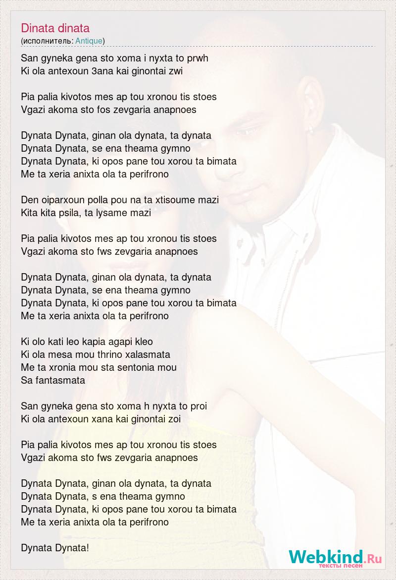 San gyneka gena sto xoma i nyxta to prwh Ki ola antexoun 3ana kai ginontai zwi Pia palia kivotos mes ap tou xronou tis stoes Vgazi akoma sto fos zevgaria anapnoes Dynata Dynata, ginan ola dynata, ta dynata Dynata Dynata, se ena theama gymno Dynata Dynata, ki opos pane tou xorou ta bimata Me ta xeria anixta ola ta perifrono Den oiparxoun polla pou na ta xtisoume mazi Kita kita psila, ta lysame mazi Pia palia kivotos mes ap tou xronou tis stoes Vgazi akoma sto fws zevgaria anapnoes Dynata Dynata, ginan ola dynata, ta dynata Dynata Dynata, se ena theama gymno Dynata Dynata, ki opos pane tou xorou ta bimata Me ta xeria anixta ola ta perifrono Ki olo kati leo kapia agapi kleo Ki ola mesa mou thrino xalasmata Me ta xronia mou sta sentonia mou Sa fantasmata San gyneka gena sto xoma h nyxta to proi Ki ola antexoun xana kai ginontai zoi Pia palia kivotos mes ap tou xronou tis stoes Vgazi akoma sto fws zevgaria anapnoes Dynata Dynata, ginan ola dynata, ta dynata Dynata Dynata, s ena theama gymno Dynata Dynata, ki opos pane tou xorou ta bimata Me ta xeria anixta ola ta perifrono Dynata Dynata!