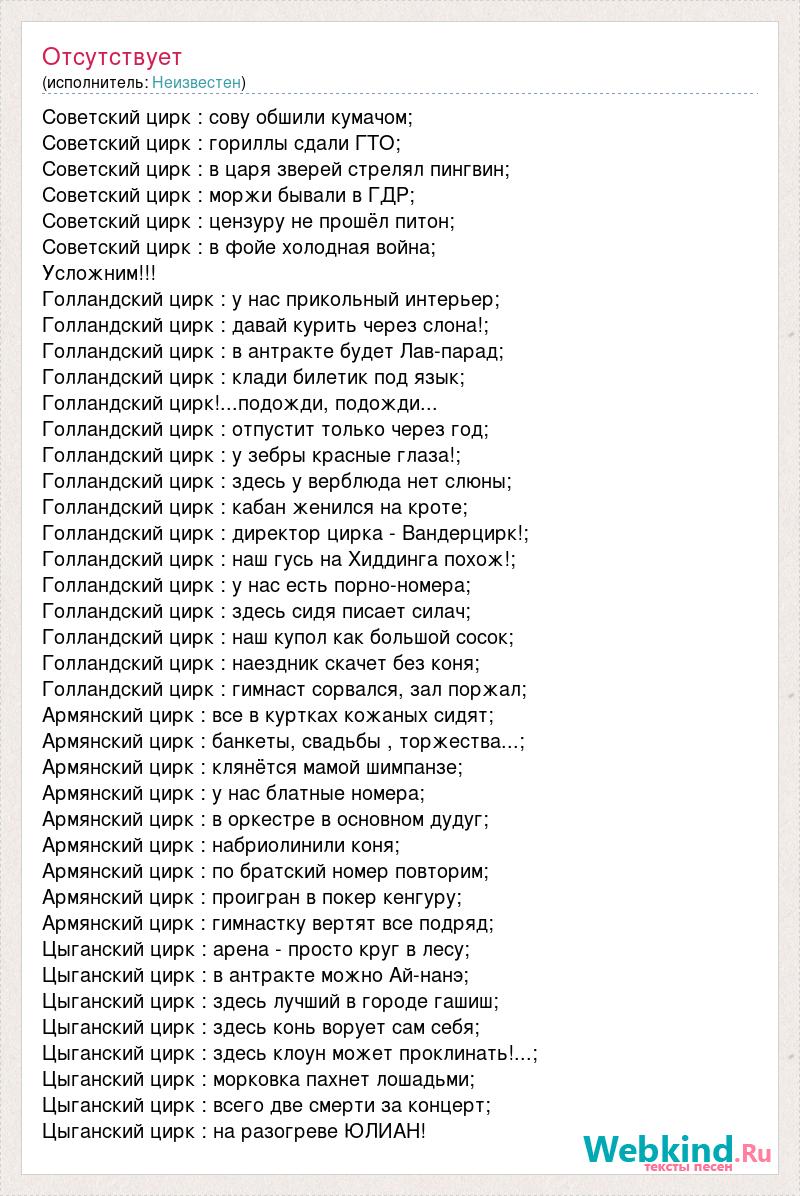 Советский цирк : сову обшили кумачом; Советский цирк : гориллы сдали ГТО; Советский цирк : в царя зверей стрелял пингвин; Советский цирк : моржи бывали в ГДР; Советский цирк : цензуру не прошёл питон; Советский цирк : в фойе холодная война; Усложним!!! Голландский цирк : у нас прикольный интерьер; Голландский цирк : давай курить через слона!; Голландский цирк : в антракте будет Лав-парад; Голландский цирк : клади билетик под язык; Голландский цирк!...подожди, подожди... Голландский цирк : отпустит только через год; Голландский цирк : у зебры красные глаза!; Голландский цирк : здесь у верблюда нет слюны; Голландский цирк : кабан женился на кроте; Голландский цирк : директор цирка - Вандерцирк!; Голландский цирк : наш гусь на Хиддинга похож!; Голландский цирк : у нас есть порно-номера; Голландский цирк : здесь сидя писает силач; Голландский цирк : наш купол как большой сосок; Голландский цирк : наездник скачет без коня; Голландский цирк : гимнаст сорвался, зал поржал; Армянский цирк : все в куртках кожаных сидят; Армянский цирк : банкеты, свадьбы , торжества...; Армянский цирк : клянётся мамой шимпанзе; Армянский цирк : у нас блатные номера; Армянский цирк : в оркестре в основном дудуг; Армянский цирк : набриолинили коня; Армянский цирк : по братский номер повторим; Армянский цирк : проигран в покер кенгуру; Армянский цирк : гимнастку вертят все подряд; Цыганский цирк : арена - просто круг в лесу; Цыганский цирк : в антракте можно Ай-нанэ; Цыганский цирк : здесь лучший в городе гашиш; Цыганский цирк : здесь конь ворует сам себя; Цыганский цирк : здесь клоун может проклинать!...; Цыганский цирк : морковка пахнет лошадьми; Цыганский цирк : всего две смерти за концерт; Цыганский цирк : на разогреве ЮЛИАН!