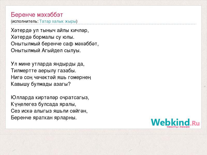 Хәтердә ул тыныч айлы кичләр, Хәтердә бормалы су юлы. Онытылмый беренче саф мәхәббәт, Онытылмый Агыйдел сылуы. Ул мине утларда яндырды да, Тилмертте аерылу газабы. Нигә соң чәчәктәй яшь гомернең Кавышу булмады азагы? Юлларда киртәләр очратсагыз, Күңелегез булсада яралы, Сез искә алыгыз яшьли сөйгән, Беренче яраткан ярларны.