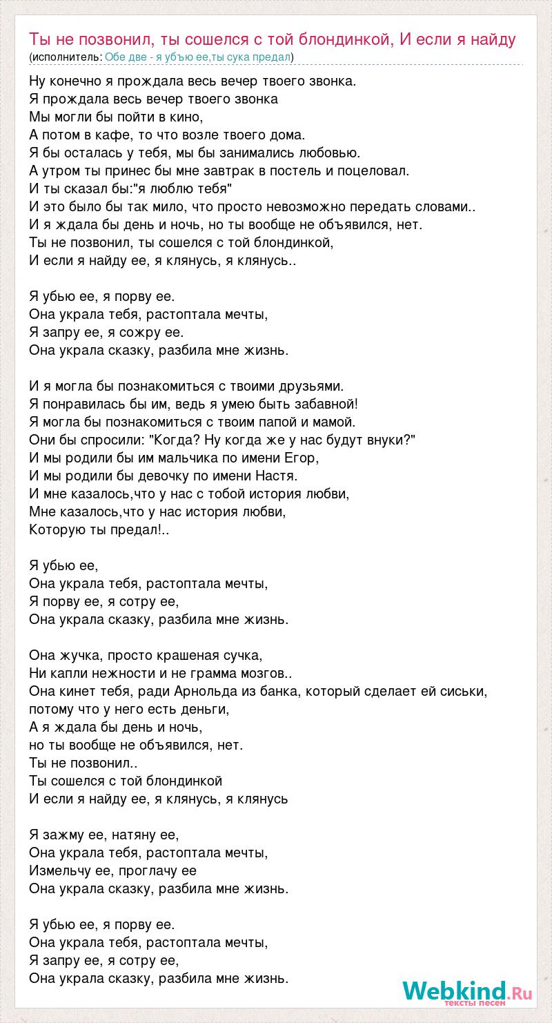 Главная→Исполнители→Обе две - я убъю ее,ты сука предал (Soko - I'll Kill Her) Я бы осталась у тебя, мы бы занимались любовью→Ты не позвонил, ты сошелся с той блондинкой, И если я найду ее, я клянусь,