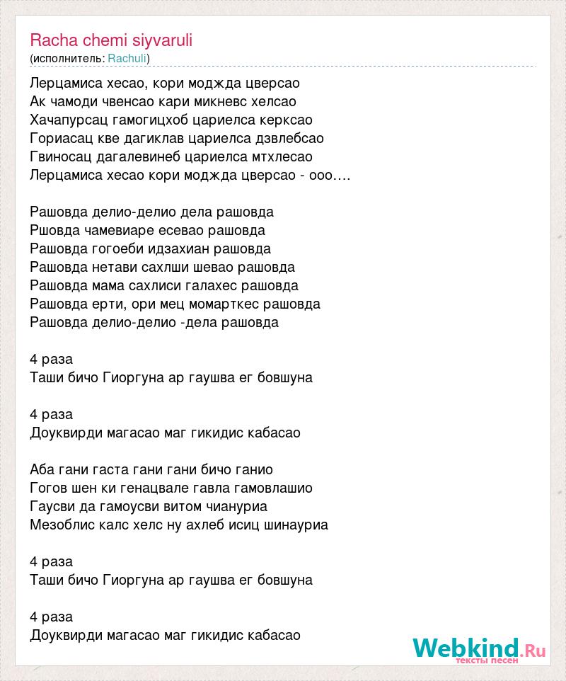 Лерцамиса хесао, кори моджда цверсао Ак чамоди чвенсао кари микневс хелсао Хачапурсац гамогицхоб цариелса керксао Гориасац кве дагиклав цариелса дзвлебсао Гвиносац дагалевинеб цариелса мтхлесао Лерцамиса хесао кори моджда цверсао - ооо…. Рашовда делио-делио дела рашовда Ршовда чамевиаре есевао рашовда Рашовда гогоеби идзахиан рашовда Рашовда нетави сахлши шевао рашовда Рашовда мама сахлиси галахес рашовда Рашовда ерти, ори мец момарткес рашовда Рашовда делио-делио -дела рашовда 4 раза Таши бичо Гиоргуна ар гаушва ег бовшуна 4 раза Доуквирди магасао маг гикидис кабасао Аба гани гаста гани гани бичо ганио Гогов шен ки генацвале гавла гамовлашио Гаусви да гамоусви витом чиануриа Мезоблис калс хелс ну ахлеб исиц шинауриа 4 раза Таши бичо Гиоргуна ар гаушва ег бовшуна 4 раза Доуквирди магасао маг гикидис кабасао