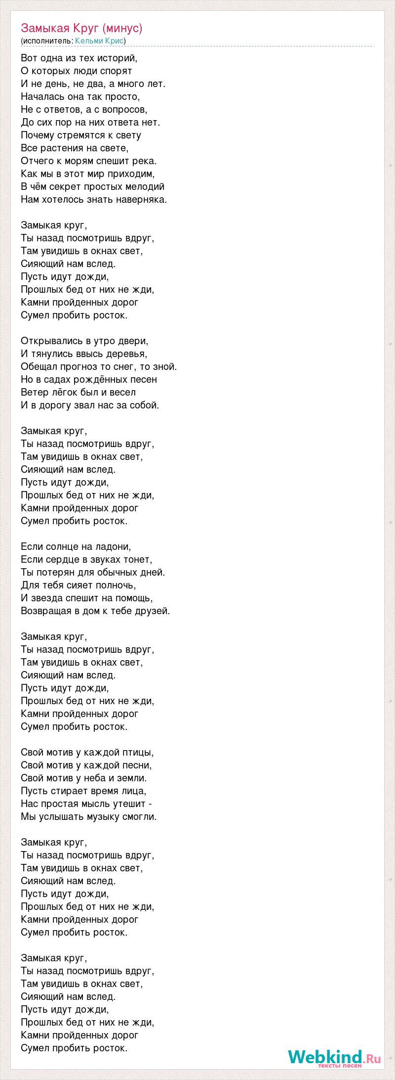 Вот одна из тех историй, О которых люди спорят И не день, не два, а много лет. Началась она так просто, Не с ответов, а с вопросов, До сих пор на них ответа нет. Почему стремятся к свету Все растения на свете, Отчего к морям спешит река. Как мы в этот мир приходим, В чём секрет простых мелодий Нам хотелось знать наверняка. Замыкая круг, Ты назад посмотришь вдруг, Там увидишь в окнах свет, Сияющий нам вслед. Пусть идут дожди, Прошлых бед от них не жди, Камни пройденных дорог Сумел пробить росток. Открывались в утро двери, И тянулись ввысь деревья, Обещал прогноз то снег, то зной. Но в садах рождённых песен Ветер лёгок был и весел И в дорогу звал нас за собой. Замыкая круг, Ты назад посмотришь вдруг, Там увидишь в окнах свет, Сияющий нам вслед. Пусть идут дожди, Прошлых бед от них не жди, Камни пройденных дорог Сумел пробить росток. Если солнце на ладони, Если сердце в звуках тонет, Ты потерян для обычных дней. Для тебя сияет полночь, И звезда спешит на помощь, Возвращая в дом к тебе друзей. Замыкая круг, Ты назад посмотришь вдруг, Там увидишь в окнах свет, Сияющий нам вслед. Пусть идут дожди, Прошлых бед от них не жди, Камни пройденных дорог Сумел пробить росток. Свой мотив у каждой птицы, Свой мотив у каждой песни, Свой мотив у неба и земли. Пусть стирает время лица, Нас простая мысль утешит - Мы услышать музыку смогли. Замыкая круг, Ты назад посмотришь вдруг, Там увидишь в окнах свет, Сияющий нам вслед. Пусть идут дожди, Прошлых бед от них не жди, Камни пройденных дорог Сумел пробить росток. Замыкая круг, Ты назад посмотришь вдруг, Там увидишь в окнах свет, Сияющий нам вслед. Пусть идут дожди, Прошлых бед от них не жди, Камни пройденных дорог Сумел пробить росток.