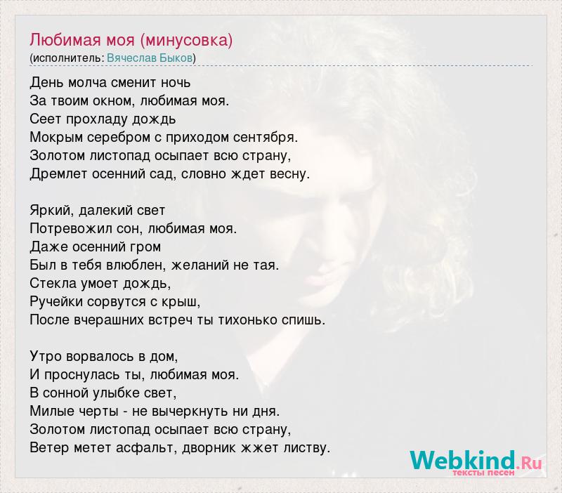День молча сменит ночь За твоим окном, любимая моя. Сеет прохладу дождь Мокрым серебром с приходом сентября. Золотом листопад осыпает всю страну, Дремлет осенний сад, словно ждет весну. Яркий, далекий свет Потревожил сон, любимая моя. Даже осенний гром Был в тебя влюблен, желаний не тая. Стекла умоет дождь, Ручейки сорвутся с крыш, После вчерашних встреч ты тихонько спишь. Утро ворвалось в дом, И проснулась ты, любимая моя. В сонной улыбке свет, Милые черты - не вычеркнуть ни дня. Золотом листопад осыпает всю страну, Ветер метет асфальт, дворник жжет листву.