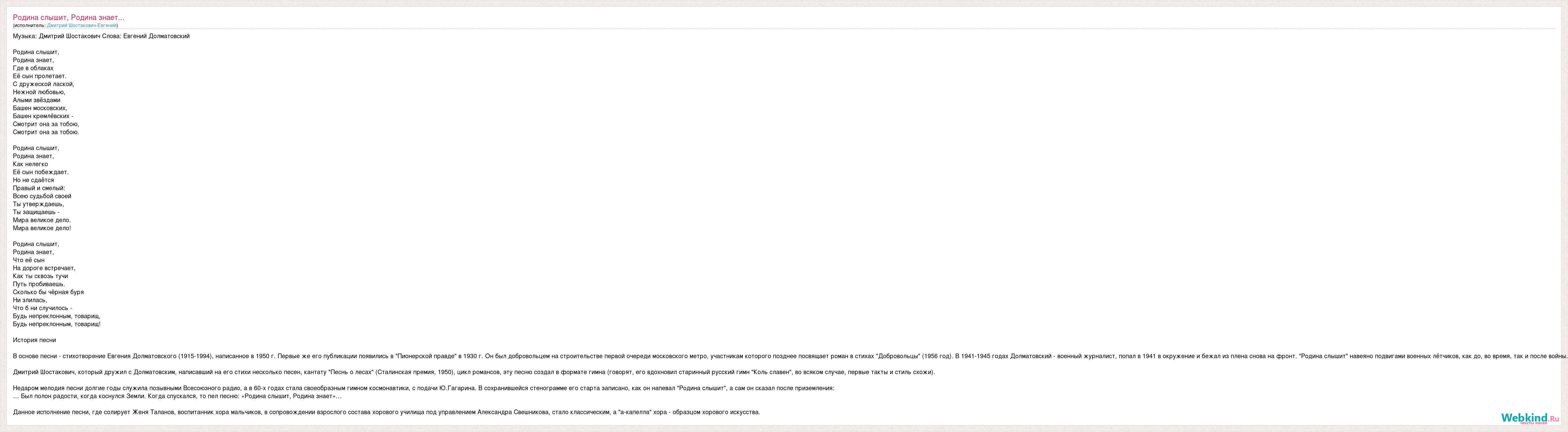 Музыка: Дмитрий Шостакович Слова: Евгений Долматовский Родина слышит, Родина знает, Где в облаках Её сын пролетает. С дружеской лаской, Нежной любовью, Алыми звёздами Башен московских, Башен кремлёвских - Смотрит она за тобою, Смотрит она за тобою. Родина слышит, Родина знает, Как нелегко Её сын побеждает. Но не сдаётся Правый и смелый: Всею судьбой своей Ты утверждаешь, Ты защищаешь - Мира великое дело. Мира великое дело! Родина слышит, Родина знает, Что её сын На дороге встречает, Как ты сквозь тучи Путь пробиваешь. Сколько бы чёрная буря Ни злилась, Что б ни случилось - Будь непреклонным, товарищ, Будь непреклонным, товарищ! История песни В основе песни - стихотворение Евгения Долматовского (1915-1994), написанное в 1950 г. Первые же его публикации появились в "Пионерской правде" в 1930 г. Он был добровольцем на строительстве первой очереди московского метро, участникам которого позднее посвящает роман в стихах "Добровольцы" (1956 год). В 1941-1945 годах Долматовский - военный журналист, попал в 1941 в окружение и бежал из плена снова на фронт. "Родина слышит" навеяно подвигами военных лётчиков, как до, во время, так и после войны. Дмитрий Шостакович, который дружил с Долматовским, написавший на его стихи несколько песен, кантату "Песнь о лесах" (Сталинская премия, 1950), цикл романсов, эту песню создал в формате гимна (говорят, его вдохновил старинный русский гимн "Коль славен", во всяком случае, первые такты и стиль схожи). Недаром мелодия песни долгие годы служила позывными Всесоюзного радио, а в 60-х годах стала своеобразным гимном космонавтики, с подачи Ю.Гагарина. В сохранившейся стенограмме его старта записано, как он напевал "Родина слышит", а сам он сказал после приземления: … Был полон радости, когда коснулся Земли. Когда спускался, то пел песню: «Родина слышит, Родина знает»… Данное исполнение песни, где солирует Женя Таланов, воспитанник хора мальчиков, в сопровождении взрослого состава хорового училища под управлением Александра Свешникова, стало классическим, а "а-капелла" хора - образцом хорового искусства.