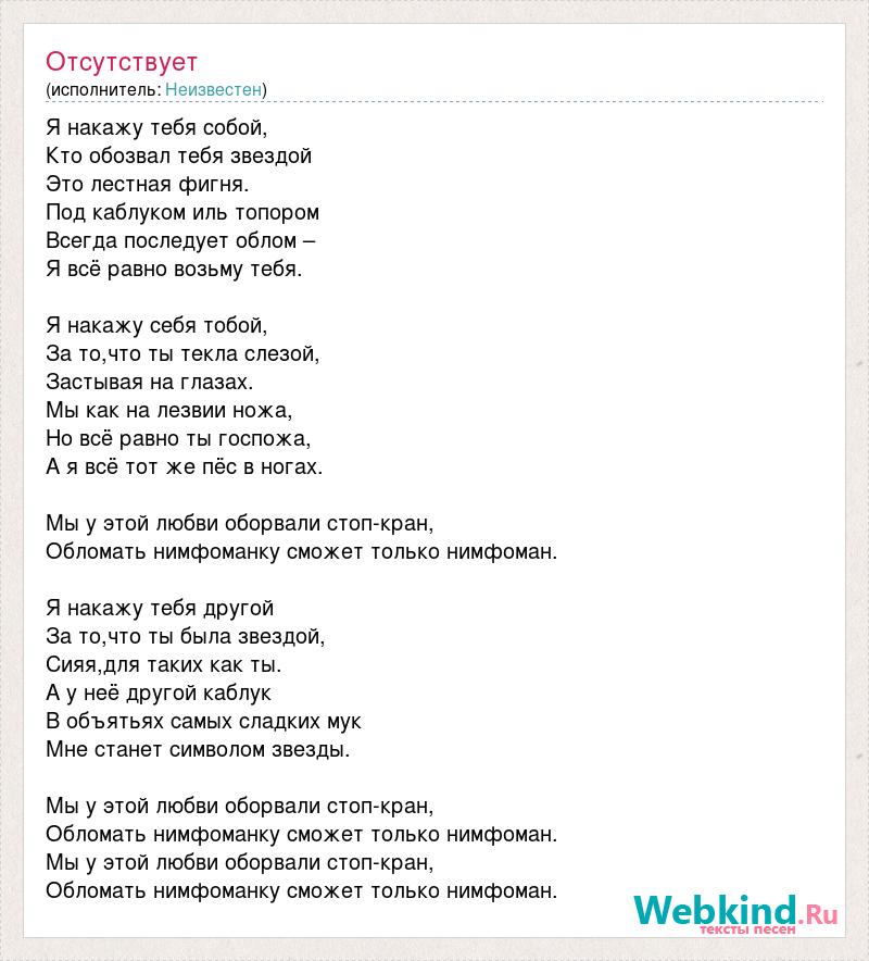 Я накажу тебя собой, Кто обозвал тебя звездой Это лестная фигня. Под каблуком иль топором Всегда последует облом – Я всё равно возьму тебя. Я накажу себя тобой, За то,что ты текла слезой, Застывая на глазах. Мы как на лезвии ножа, Но всё равно ты госпожа, А я всё тот же пёс в ногах. Мы у этой любви оборвали стоп-кран, Обломать нимфоманку сможет только нимфоман. Я накажу тебя другой За то,что ты была звездой, Сияя,для таких как ты. А у неё другой каблук В объятьях самых сладких мук Мне станет символом звезды. Мы у этой любви оборвали стоп-кран, Обломать нимфоманку сможет только нимфоман. Мы у этой любви оборвали стоп-кран, Обломать нимфоманку сможет только нимфоман.