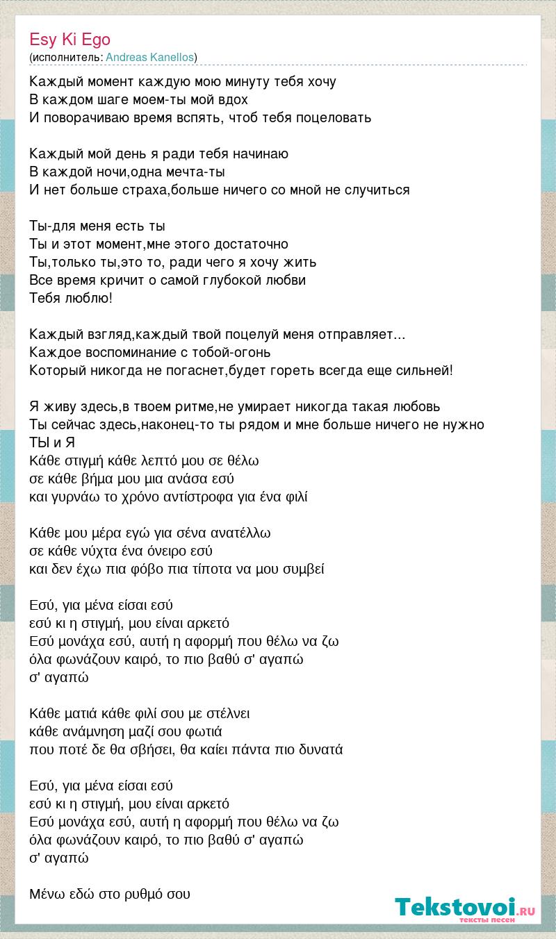 Каждый момент каждую мою минуту тебя хочу В каждом шаге моем-ты мой вдох И поворачиваю время вспять, чтоб тебя поцеловать Каждый мой день я ради тебя начинаю В каждой ночи,одна мечта-ты И нет больше страха,больше ничего со мной не случиться Ты-для меня есть ты Ты и этот момент,мне этого достаточно Ты,только ты,это то, ради чего я хочу жить Все время кричит о самой глубокой любви Тебя люблю! Каждый взгляд,каждый твой поцелуй меня отправляет... Каждое воспоминание с тобой-огонь Который никогда не погаснет,будет гореть всегда еще сильней! Я живу здесь,в твоем ритме,не умирает никогда такая любовь Ты сейчас здесь,наконец-то ты рядом и мне больше ничего не нужно ТЫ и Я Κάθε στιγμή κάθε λεπτό μου σε θέλω σε κάθε βήμα μου μια ανάσα εσύ και γυρνάω το χρόνο αντίστροφα για ένα φιλί Κάθε μου μέρα εγώ για σένα ανατέλλω σε κάθε νύχτα ένα όνειρο εσύ και δεν έχω πια φόβο πια τίποτα να μου συμβεί Εσύ, για μένα είσαι εσύ εσύ κι η στιγμή, μου είναι αρκετό Εσύ μονάχα εσύ, αυτή η αφορμή που θέλω να ζω όλα φωνάζουν καιρό, το πιο βαθύ σ' αγαπώ σ' αγαπώ Κάθε ματιά κάθε φιλί σου με στέλνει κάθε ανάμνηση μαζί σου φωτιά που ποτέ δε θα σβήσει, θα καίει πάντα πιο δυνατά Εσύ, για μένα είσαι εσύ εσύ κι η στιγμή, μου είναι αρκετό Εσύ μονάχα εσύ, αυτή η αφορμή που θέλω να ζω όλα φωνάζουν καιρό, το πιο βαθύ σ' αγαπώ σ' αγαπώ Μένω εδώ στο ρυθμό σου