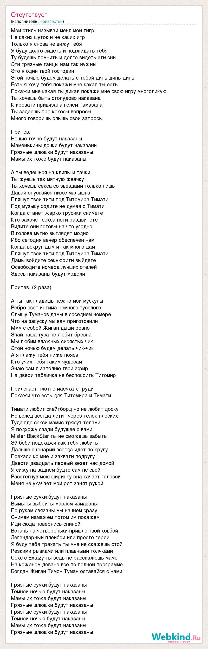 Мой стиль называй меня мой тигр Не каких шуток и не каких игр Только я снова не вижу тебя Я буду долго сидеть и поджидать тебя Ту будешь помнить и долго видеть эти сны Эти грязные танцы нам так нужны Это я один твой господин Этой ночью будем делать с тобой динь-динь-динь Есть я хочу тебя покажи мне какая ты есть Покажи мне какая ты дикая покажи мне свою игру многоликую Ты хочешь быть стопудово наказана К кровати привязана гелем намазана Ты задаешь про кокосы вопросы Много говоришь слышь свои запросы Припев: Ночью точно будут наказаны Маменькины дочки будут наказаны Грязные шлюшки будут наказаны Мамы их тоже будут наказаны А ты ведешься на клипы и тачки Ты жуешь так мятную жвачку Ты хочешь секса со звездами только лишь Давай опускайся ниже малышка Пляшут твои тити под Титомира Тимати Под музыку ходите не думая о Тимати Когда станет жарко трусики снимете Кто захочет секса ноги раздвинете Видите они готовы на что угодно В голове мутно выглядят модно Ибо сегодня вечер обеспечен нам Когда вокруг дым и так много дам Пляшут твои тити под Титомира Тимати Дамы войдите секьюрити выйдете Освободите номера лучших отелей Здесь наказаны будут модели Припев. (2 раза) А ты так гладишь нежно мои мускулы Ребро свет интима немного тусклого Слышу Туманов дамы в соседнем номере Что на закуску мы вам приготовили Ммм с собой Жиган дыши ровно Знай наша туса не любит бревна Мы любим влажных сисястых чик Этой ночью будем делать чик-чик А я глажу тебя ниже пояса Кто учил тебя таким чудесам Знаю сам я заполню твой эфир На двери табличка не беспокоить Титомир Прилегает плотно маечка к груди Покажи что есть для Титомира и Тимати Тимати любит скейтборд но не любит доску Но вслед всегда летит через телок плоских Туда где секси мамис трясут телами Я подхожу сзади будущее с вами Mister BlackStar ты не сможешь забыть Эй беби подскажи как тебя любить Дальше сценарий всегда идет по кругу Поехали ко мне и захвати подругу Двести двадцать первый везет нас домой Я сижу на заднем будто сам не свой Расстегнув мою ширинку она качает головой Меня не укачает мой рот занят рукой Грязные сучки будут наказаны Вымыты выбриты маслом измазаны По рукам связаны мы начнем сразу Снимем намажем потом им покажем Иди сюда повернись спиной Встань на четвереньки пришло твой ковбой Легендарный плейбой или просто герой Я буду тебя трахать ты мне не скажешь стой Резкими рывками или плавными толчками Секс с Extazy ты ведь не расскажешь маме На кожаном деване все по полной программе Богдан Жиган Тимон Туман оставайся с нами Грязные сучки будут наказаны Темной ночью будут наказаны Мамы их тоже будут наказаны Грязные шлюшки будут наказаны Грязные сучки будут наказаны Темной ночью будут наказаны Мамы их тоже будут наказаны Грязные шлюшки будут наказаны