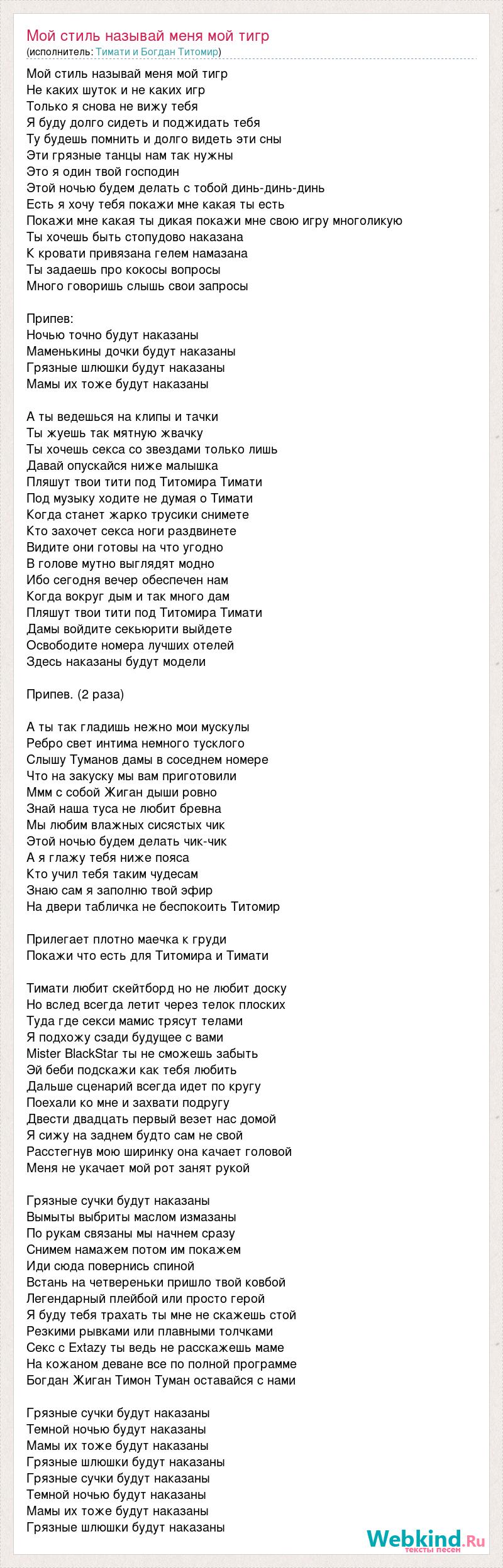 Мой стиль называй меня мой тигр Не каких шуток и не каких игр Только я снова не вижу тебя Я буду долго сидеть и поджидать тебя Ту будешь помнить и долго видеть эти сны Эти грязные танцы нам так нужны Это я один твой господин Этой ночью будем делать с тобой динь-динь-динь Есть я хочу тебя покажи мне какая ты есть Покажи мне какая ты дикая покажи мне свою игру многоликую Ты хочешь быть стопудово наказана К кровати привязана гелем намазана Ты задаешь про кокосы вопросы Много говоришь слышь свои запросы Припев: Ночью точно будут наказаны Маменькины дочки будут наказаны Грязные шлюшки будут наказаны Мамы их тоже будут наказаны А ты ведешься на клипы и тачки Ты жуешь так мятную жвачку Ты хочешь секса со звездами только лишь Давай опускайся ниже малышка Пляшут твои тити под Титомира Тимати Под музыку ходите не думая о Тимати Когда станет жарко трусики снимете Кто захочет секса ноги раздвинете Видите они готовы на что угодно В голове мутно выглядят модно Ибо сегодня вечер обеспечен нам Когда вокруг дым и так много дам Пляшут твои тити под Титомира Тимати Дамы войдите секьюрити выйдете Освободите номера лучших отелей Здесь наказаны будут модели Припев. (2 раза) А ты так гладишь нежно мои мускулы Ребро свет интима немного тусклого Слышу Туманов дамы в соседнем номере Что на закуску мы вам приготовили Ммм с собой Жиган дыши ровно Знай наша туса не любит бревна Мы любим влажных сисястых чик Этой ночью будем делать чик-чик А я глажу тебя ниже пояса Кто учил тебя таким чудесам Знаю сам я заполню твой эфир На двери табличка не беспокоить Титомир Прилегает плотно маечка к груди Покажи что есть для Титомира и Тимати Тимати любит скейтборд но не любит доску Но вслед всегда летит через телок плоских Туда где секси мамис трясут телами Я подхожу сзади будущее с вами Mister BlackStar ты не сможешь забыть Эй беби подскажи как тебя любить Дальше сценарий всегда идет по кругу Поехали ко мне и захвати подругу Двести двадцать первый везет нас домой Я сижу на заднем будто сам не свой Расстегнув мою ширинку она качает головой Меня не укачает мой рот занят рукой Грязные сучки будут наказаны Вымыты выбриты маслом измазаны По рукам связаны мы начнем сразу Снимем намажем потом им покажем Иди сюда повернись спиной Встань на четвереньки пришло твой ковбой Легендарный плейбой или просто герой Я буду тебя трахать ты мне не скажешь стой Резкими рывками или плавными толчками Секс с Extazy ты ведь не расскажешь маме На кожаном деване все по полной программе Богдан Жиган Тимон Туман оставайся с нами Грязные сучки будут наказаны Темной ночью будут наказаны Мамы их тоже будут наказаны Грязные шлюшки будут наказаны Грязные сучки будут наказаны Темной ночью будут наказаны Мамы их тоже будут наказаны Грязные шлюшки будут наказаны