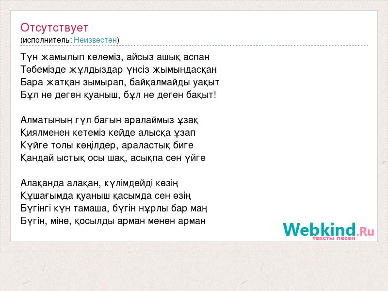 Түн жамылып келеміз, айсыз ашық аспан Төбемізде жұлдыздар үнсіз жымындасқан Бара жатқан зымырап, байқалмайды уақыт Бұл не деген қуаныш, бұл не деген бақыт! Алматының гүл бағын аралаймыз ұзақ Қиялменен кетеміз кейде алысқа ұзап Күйге толы көңілдер, араластық биге Қандай ыстық осы шақ, асықпа сен үйге Алақанда алақан, күлімдейді көзің Құшағымда қуаныш қасымда сен өзің Бүгінгі күн тамаша, бүгін нұрлы бар маң Бүгін, міне, қосылды арман менен арман