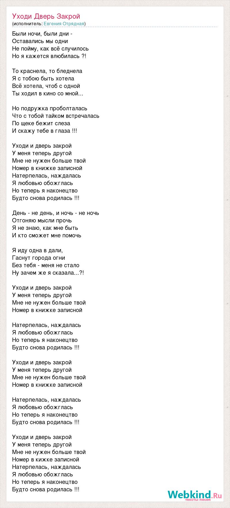 Были ночи, были дни - Оставались мы одни Не пойму, как всё случилось Но я кажется влюбилась ?! То краснела, то бледнела Я с тобою быть хотела Всё хотела, чтоб с одной Ты ходил в кино со мной... Но подружка проболталась Что с тобой тайком встречалась По щеке бежит слеза И скажу тебе в глаза !!! Уходи и дверь закрой У меня теперь другой Мне не нужен больше твой Номер в книжке записной Натерпелась, наждалась Я любовью обожглась Но теперь я наконецтво Будто снова родилась !!! День - не день, и ночь - не ночь Отгоняю мысли прочь Я не знаю, как мне быть И кто сможет мне помочь Я иду одна в дали, Гаснут города огни Без тебя - меня не стало Ну зачем же я сказала...?! Уходи и дверь закрой У меня теперь другой Мне не нужен больше твой Номер в книжке записной Натерпелась, наждалась Я любовью обожглась Но теперь я наконецтво Будто снова родилась !!! Уходи и дверь закрой У меня теперь другой Мне не нужен больше твой Номер в книжке записной Натерпелась, наждалась Я любовью обожглась Но теперь я наконецтво Будто снова родилась !!! Уходи и дверь закрой У меня теперь другой Мне не нужен больше твой Номер в кижке записной Натерпелась, наждалась Я любовью обожглась Но теперь я наконецтво Будто снова родилась !!!