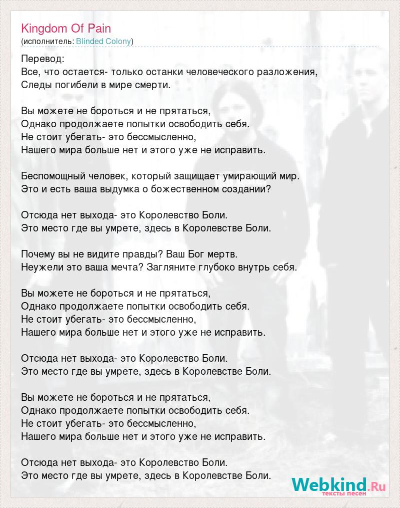 Перевод: Все, что остается- только останки человеческого разложения, Следы погибели в мире смерти. Вы можете не бороться и не прятаться, Однако продолжаете попытки освободить себя. Не стоит убегать- это бессмысленно, Нашего мира больше нет и этого уже не исправить. Беспомощный человек, который защищает умирающий мир. Это и есть ваша выдумка о божественном создании? Отсюда нет выхода- это Королевство Боли. Это место где вы умрете, здесь в Королевстве Боли. Почему вы не видите правды? Ваш Бог мертв. Неужели это ваша мечта? Загляните глубоко внутрь себя. Вы можете не бороться и не прятаться, Однако продолжаете попытки освободить себя. Не стоит убегать- это бессмысленно, Нашего мира больше нет и этого уже не исправить. Отсюда нет выхода- это Королевство Боли. Это место где вы умрете, здесь в Королевстве Боли. Вы можете не бороться и не прятаться, Однако продолжаете попытки освободить себя. Не стоит убегать- это бессмысленно, Нашего мира больше нет и этого уже не исправить. Отсюда нет выхода- это Королевство Боли. Это место где вы умрете, здесь в Королевстве Боли.
