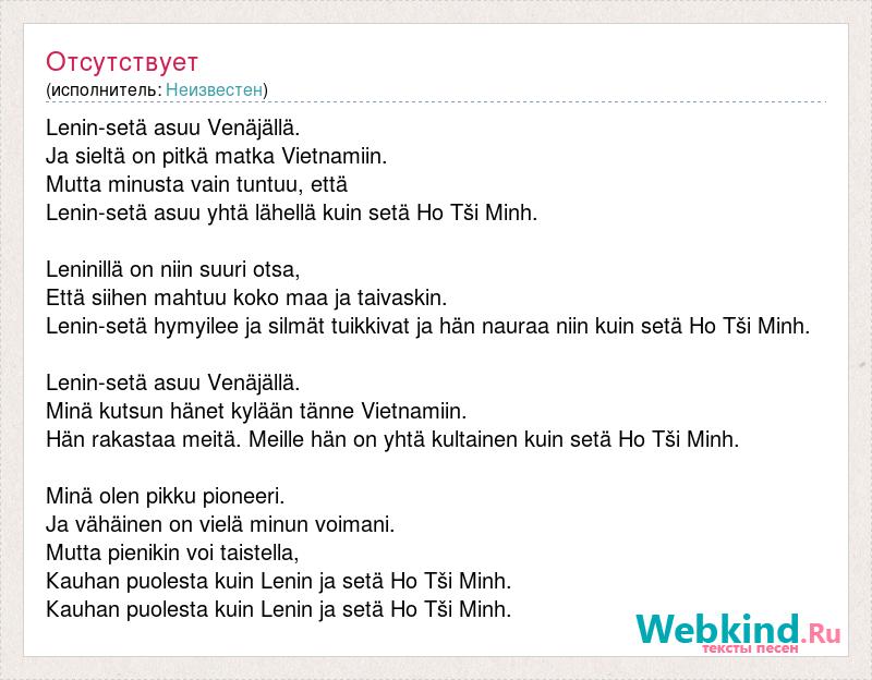 Lenin-setä asuu Venäjällä. Ja sieltä on pitkä matka Vietnamiin. Mutta minusta vain tuntuu, että Lenin-setä asuu yhtä lähellä kuin setä Ho Tši Minh. Leninillä on niin suuri otsa, Еttä siihen mahtuu koko maa ja taivaskin. Lenin-setä hymyilee ja silmät tuikkivat ja hän nauraa niin kuin setä Ho Tši Minh. Lenin-setä asuu Venäjällä. Minä kutsun hänet kylään tänne Vietnamiin. Hän rakastaa meitä. Meille hän on yhtä kultainen kuin setä Ho Tši Minh. Minä olen pikku pioneeri. Ja vähäinen on vielä minun voimani. Mutta pienikin voi taistella, Кauhan puolesta kuin Lenin ja setä Ho Tši Minh. Кauhan puolesta kuin Lenin ja setä Ho Tši Minh.