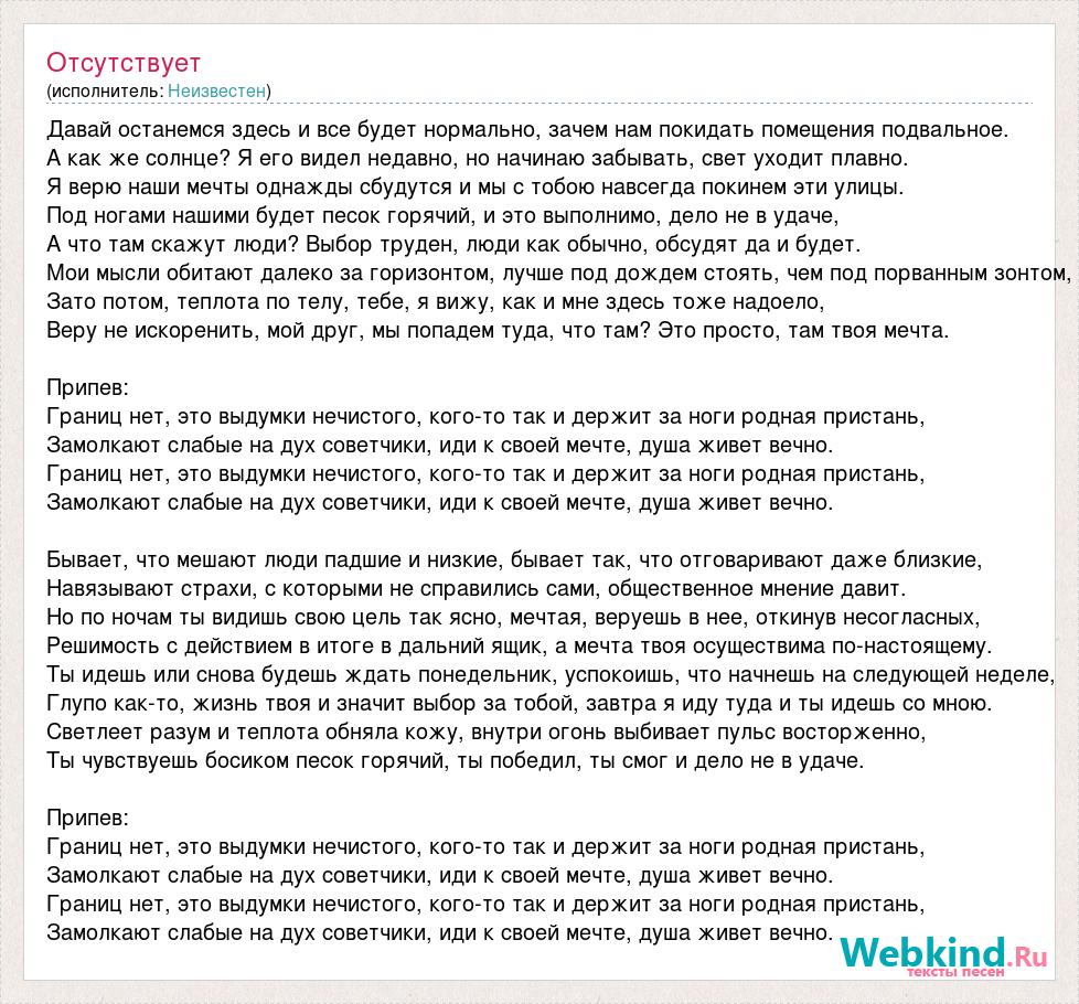 Давай останемся здесь и все будет нормально, зачем нам покидать помещения подвальное. А как же солнце? Я его видел недавно, но начинаю забывать, свет уходит плавно. Я верю наши мечты однажды сбудутся и мы с тобою навсегда покинем эти улицы. Под ногами нашими будет песок горячий, и это выполнимо, дело не в удаче, А что там скажут люди? Выбор труден, люди как обычно, обсудят да и будет. Мои мысли обитают далеко за горизонтом, лучше под дождем стоять, чем под порванным зонтом, Зато потом, теплота по телу, тебе, я вижу, как и мне здесь тоже надоело, Веру не искоренить, мой друг, мы попадем туда, что там? Это просто, там твоя мечта. Припев: Границ нет, это выдумки нечистого, кого-то так и держит за ноги родная пристань, Замолкают слабые на дух советчики, иди к своей мечте, душа живет вечно. Границ нет, это выдумки нечистого, кого-то так и держит за ноги родная пристань, Замолкают слабые на дух советчики, иди к своей мечте, душа живет вечно. Бывает, что мешают люди падшие и низкие, бывает так, что отговаривают даже близкие, Навязывают страхи, с которыми не справились сами, общественное мнение давит. Но по ночам ты видишь свою цель так ясно, мечтая, веруешь в нее, откинув несогласных, Решимость с действием в итоге в дальний ящик, а мечта твоя осуществима по-настоящему. Ты идешь или снова будешь ждать понедельник, успокоишь, что начнешь на следующей неделе, Глупо как-то, жизнь твоя и значит выбор за тобой, завтра я иду туда и ты идешь со мною. Светлеет разум и теплота обняла кожу, внутри огонь выбивает пульс восторженно, Ты чувствуешь босиком песок горячий, ты победил, ты смог и дело не в удаче. Припев: Границ нет, это выдумки нечистого, кого-то так и держит за ноги родная пристань, Замолкают слабые на дух советчики, иди к своей мечте, душа живет вечно. Границ нет, это выдумки нечистого, кого-то так и держит за ноги родная пристань, Замолкают слабые на дух советчики, иди к своей мечте, душа живет вечно.